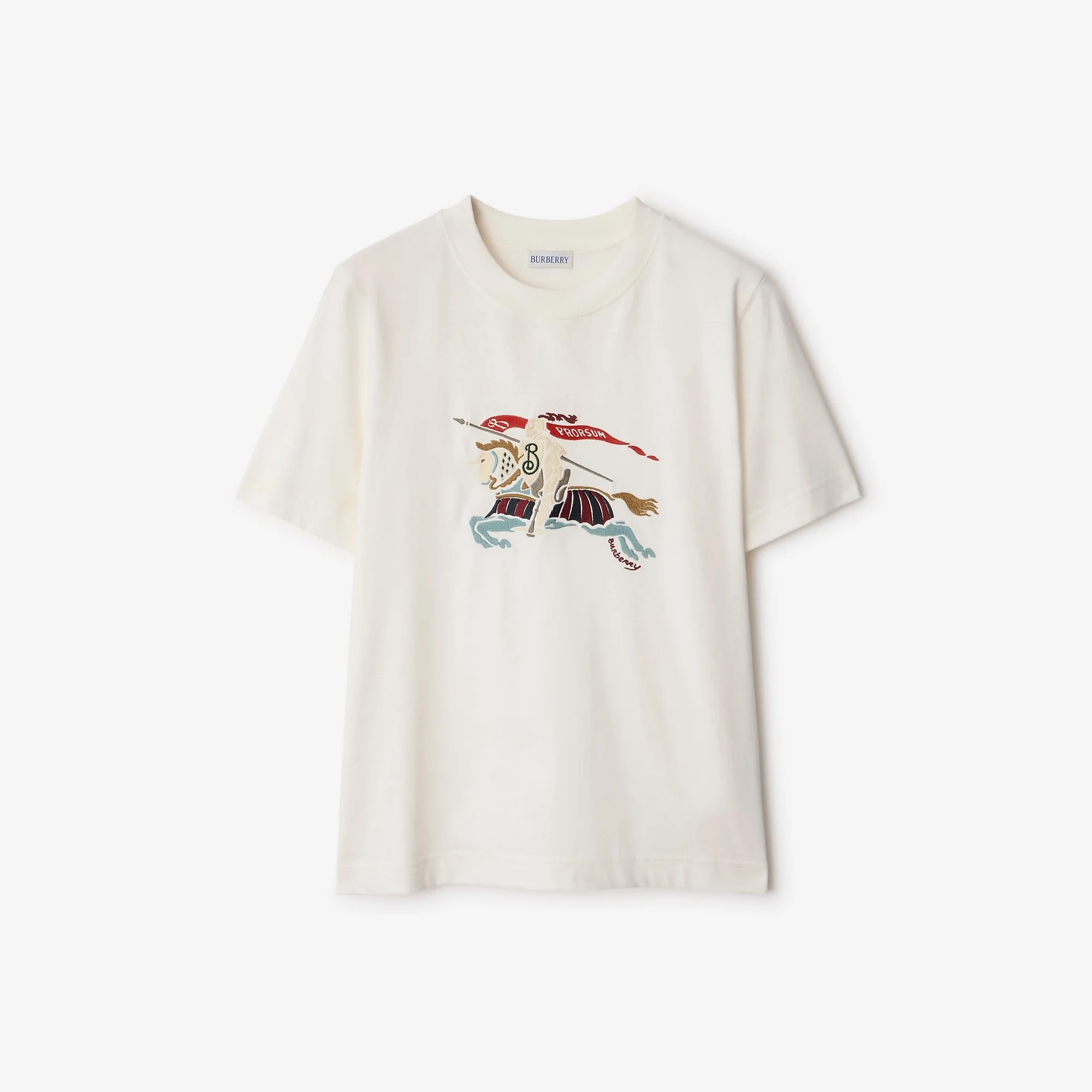 Product Details A T-shirt made from cotton jersey, cut to a relaxed fit. The style is embroidered with a colourful take on our Equestrian Knight Design. - Rib-knit neckline - Embroidered Burberry lettering at front - Relaxed fit: a looser cut than our regular fit. - Machine wash - Item 81151461 Size & Fit - Length: 61cm/24in (size UK S) - Model’s height: 180cm/5ft 11in. Model wears size UK S Fabric & Care - 100% cotton - Trim: 97% cotton, 3% elastane - Made in Portugal