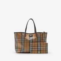 Product Details Rooted in the outdoors, a tote bag made in Italy from a cotton linen blend trimmed with smooth calf leather. The fabric is jacquard-woven with the Burberry Check and has a coated finish inspired by rainwear. The unlined design is detailed with our Knight stamp, an archival motif first seen on Burberry bags in the 1980s. - Leather top handles - Press-stud closure - Detachable pouch - Hand-painted edges - Leather patch with Equestrian Knight Design at front - Unlined - Comes with a dust bag - Item 81122221 Size & Fit - 38 x 16.5 x 28cm/15 x 6.5 x 11in. Handle drop: 24cm/9.5in Fabric & Care - 69% cotton, 21% viscose, 10% linen - Trim: 100% calf leather - Pocket lining: 100% cotton - Made in Italy