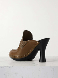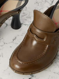 EDITORS'NOTES Burberry's mules draw inspiration from both clogs and loafers. Made in Italy from leather, they have laser-cut notched vamps and penny straps that feature B-shaped cutouts at the center. Burnished gold-tone studs punctuate the wooden soles, while the footbed reveals the signature checked motif. SIZE & FIT - Fits true to size, take your normal size - Only available in full sizes, go up to the nearest whole size if you take a half size - Italian sizing DETAILS & CARE - Heel measures approximately 75mm/ 3 inches - Brown leather - Slip on