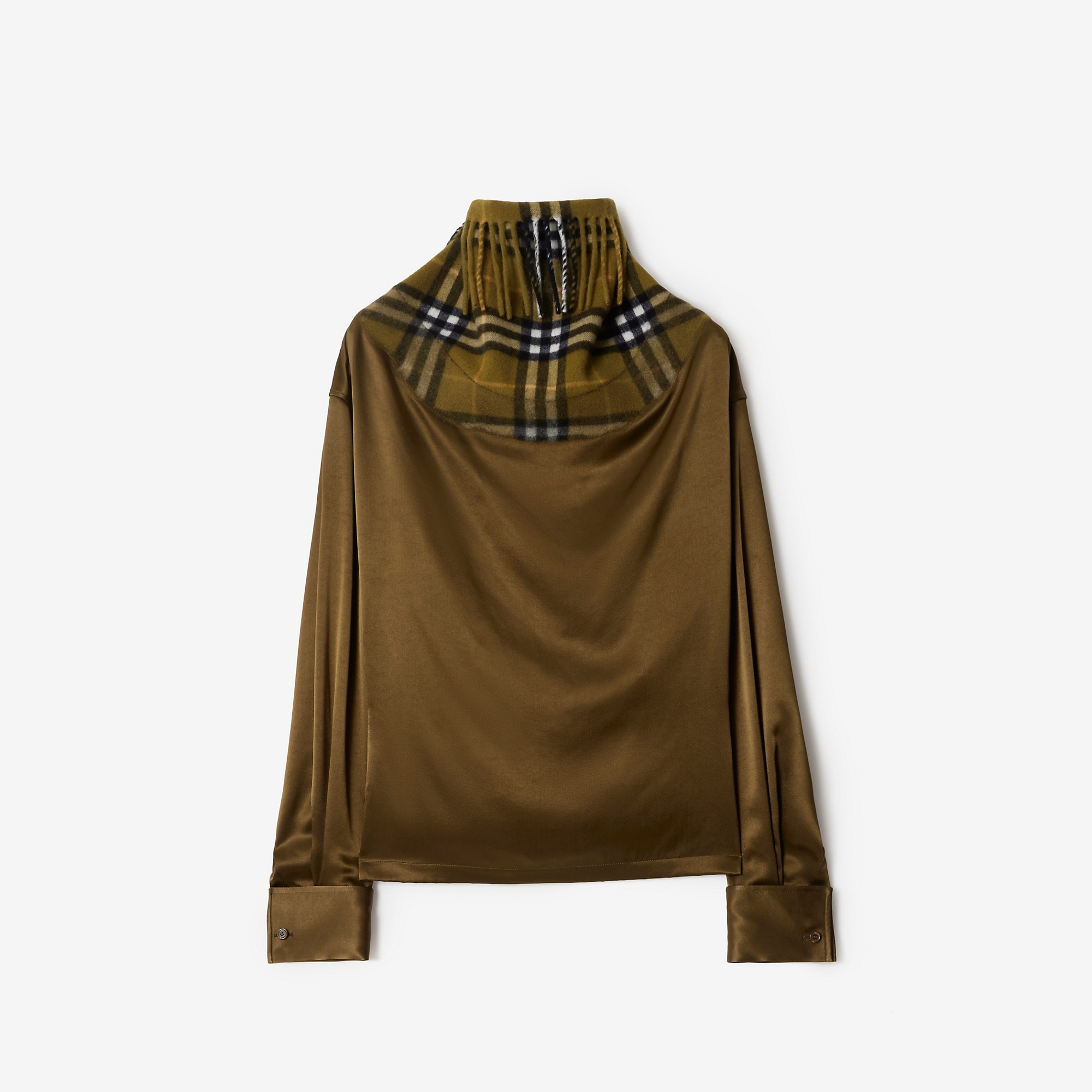 Product Details A long-sleeved top made in Italy from viscose satin. Inspired by the iconic Burberry Check scarf, the degrade design is seamlessly topped with a wool cashmere collar in a textured needle punch technique. - Fringing at collar - Double cuffs - Straight hem - Regular fit. Fits true to size, take your normal size. - Item 80991161 Size & Fit - Length: 63cm/24.8in (size UK 6) - Model’s height: 176cm/5ft 9in. Model wears size UK 6 Fabric & Care - 100% viscose - Panel: 85% wool, 15% cashmere - Buttons: mother-of-pearl - Specialist dry clean - Made in Italy