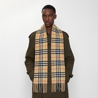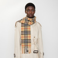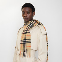 Product Details The iconic Burberry Check cashmere scarf, made in Scotland at a mill founded in 1797. Woven on traditional looms, the scarf takes more than 30 steps to complete. The fabric is washed in local spring water and brushed with teasels – dried flowers that are drawn along the surface of the cashmere to 'raise' the cloth, creating a natural lustre and ultra-soft finish. - Rectangular - Fringing at both ends - Item 81133771 Size & Fit - 168 x 15cm/66.1 x 5.9in Fabric & Care - 100% cashmere - Specialist dry clean - Made in Scotland