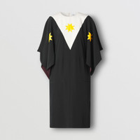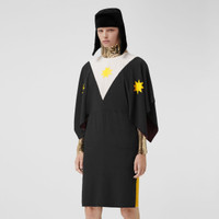 PRODUCT DETAILS A crew-neck dress cut from fluid silk crepe de chine, sculpted with voluminous cape sleeves. The Italian-made piece is patterned with a geometric print. The design made its debut in Riccardo Tisci’s Autumn/Winter 2021 womenswear collection, a bold interpretation of modern femininity that celebrates freedom of expression. Dress length: 92.5cm/36.4in. This is based on a size UK 6 as proportions change slightly according to size. Model’s height: 177cm/5ft 10in. Model wears size UK 8. 100% silk Concealed back zip closure Front welt pockets, side slip pockets Specialist dry clean Made in Italy 80467321