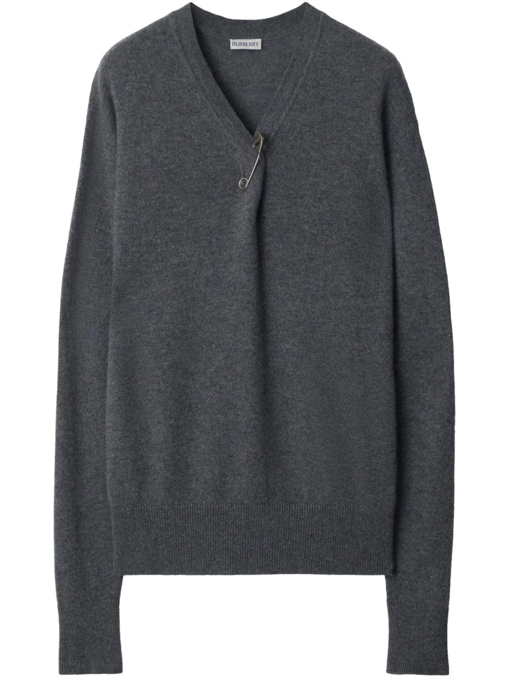 cashmere jumper Highlights - Charcoal grey - Safety pin detail - V-neck - Long sleeves Made in United Kingdom Composition Cashmere 100%