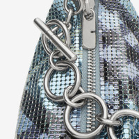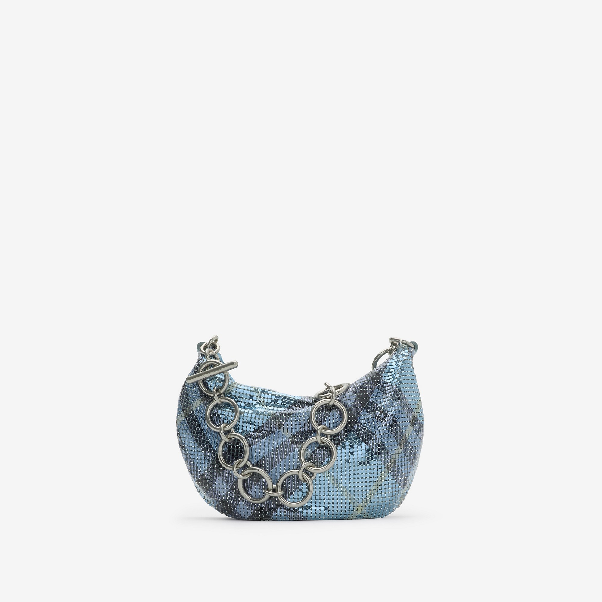 Product Details A softly structured bag made in Italy from metallic mesh printed with the Burberry Check. The mini shape is lined in suede and features a chunky chain-link strap looped with a T-bar fastening to create our signature ‘b’. - Zip closure - Chain strap - Brushed metal hardware - Engraved Burberry lettering at T-bar - Suede lining - Comes with a dust bag - Item 81083981 Size & Fit - 18 x 4 x 14cm/7.1 x 1.6 x 5.5in. Strap drop: 25cm/9.8in Fabric & Care - Outer: 100% brass - Lining: 100% calf suede - Made in Italy