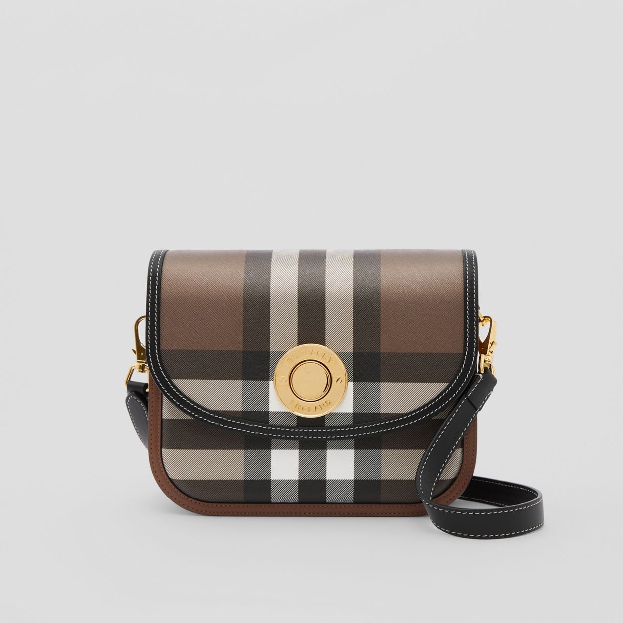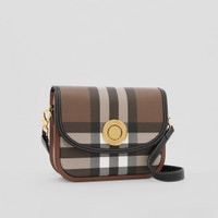 PRODUCT DETAILS A structured satchel in our Exaggerated Check and topstitched leather, sculpted with a reinforced front panel to preserve its elegant curves. The design is accented with gold-plated logo-engraved eyelets and a push-button closure in the shape of our logo graphic. In a nod to our history, the style shares its name with Thomas Burberry’s mother, sister and first-born daughter. Carry crossbody or on the shoulder using the detachable, adjustable strap. The main material of this product is made with at least 30% bio-based materials. Bio-based materials are derived from renewable natural resources such as plants and castor oil. 23.5 x 7 x 19.5cm/9.3 x 2.8 x 7.7in Min. strap drop: 48cm/18.9in Max. strap drop: 52cm/20.5in Outer: 55% cotton, 45% polyurethane Trim: 100% calf leather Lining: 100% lambskin Detachable, adjustable crossbody strap One interior slip pocket Foldover top with push-button closure Hand-painted edges Polished metal hardware Made in Italy 80571361