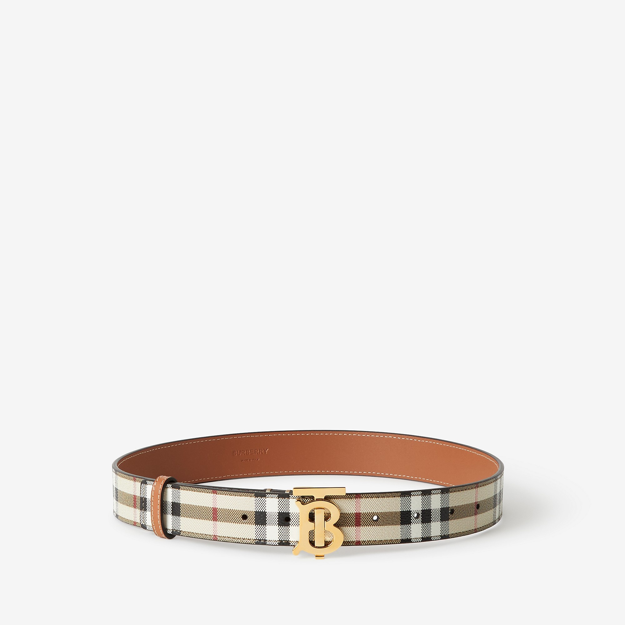 Product Details Crafted in Burberry Check and smooth leather, secured with a gold-plated Thomas Burberry Monogram plaque buckle. - Hand-painted edges - Polished metal hardware - Item 80704101 Size & Fit - 3cm/1.2in wide Fabric & Care - Outer: 71% polyurethane, 16% polyester, 12% cotton, 1% acrylic* - Lining: 100% leather - Buckle: 100% brass with gold plating - *The main material of this product is made with at least 30% bio-based materials - Bio-based materials are derived from renewable natural resources such as plants - Made in Italy
