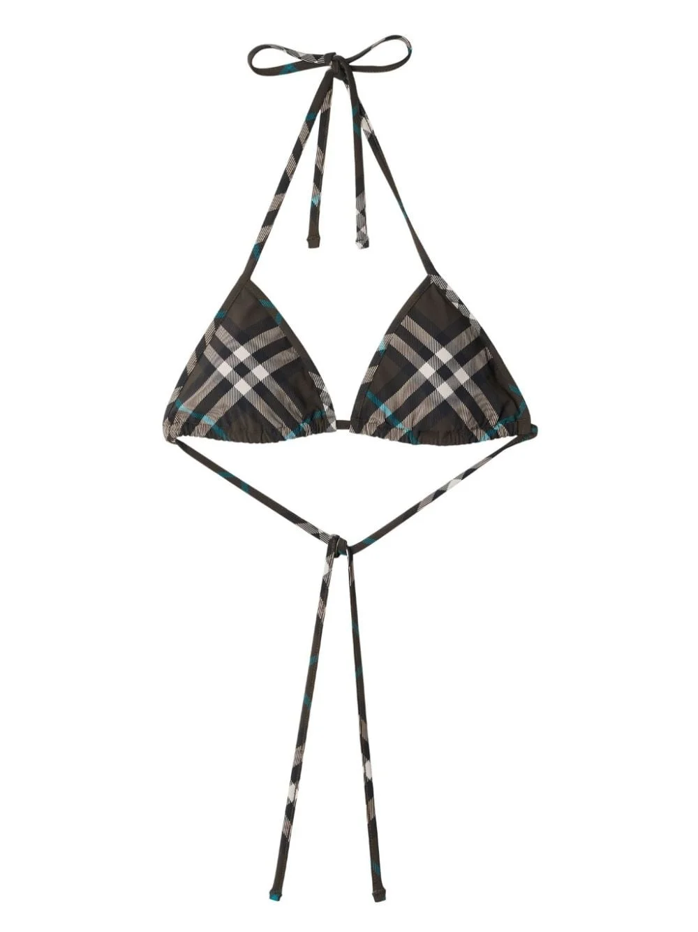 check bikini top Highlights - Brown/blue/white - Triangle cup - House check print - Halterneck tie fastening - Removable padded cups - Rear tie fastening - Matching drawstring bag Imported Composition Outer: Polyamide 73%, Spandex/Elastane 27% Lining: Polyamide 59%, Spandex/Elastane 41% Washing instructions Read Manufacturer Guidelines