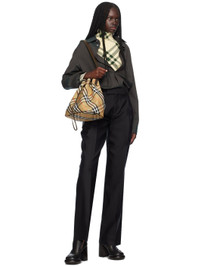 Cotton twill shoulder bag in beige. · Check pattern and piping throughout · Adjustable shoulder strap · Logo flag at base · Drawstring closure · 11.5" x W11" x D6" Supplier color: Sand