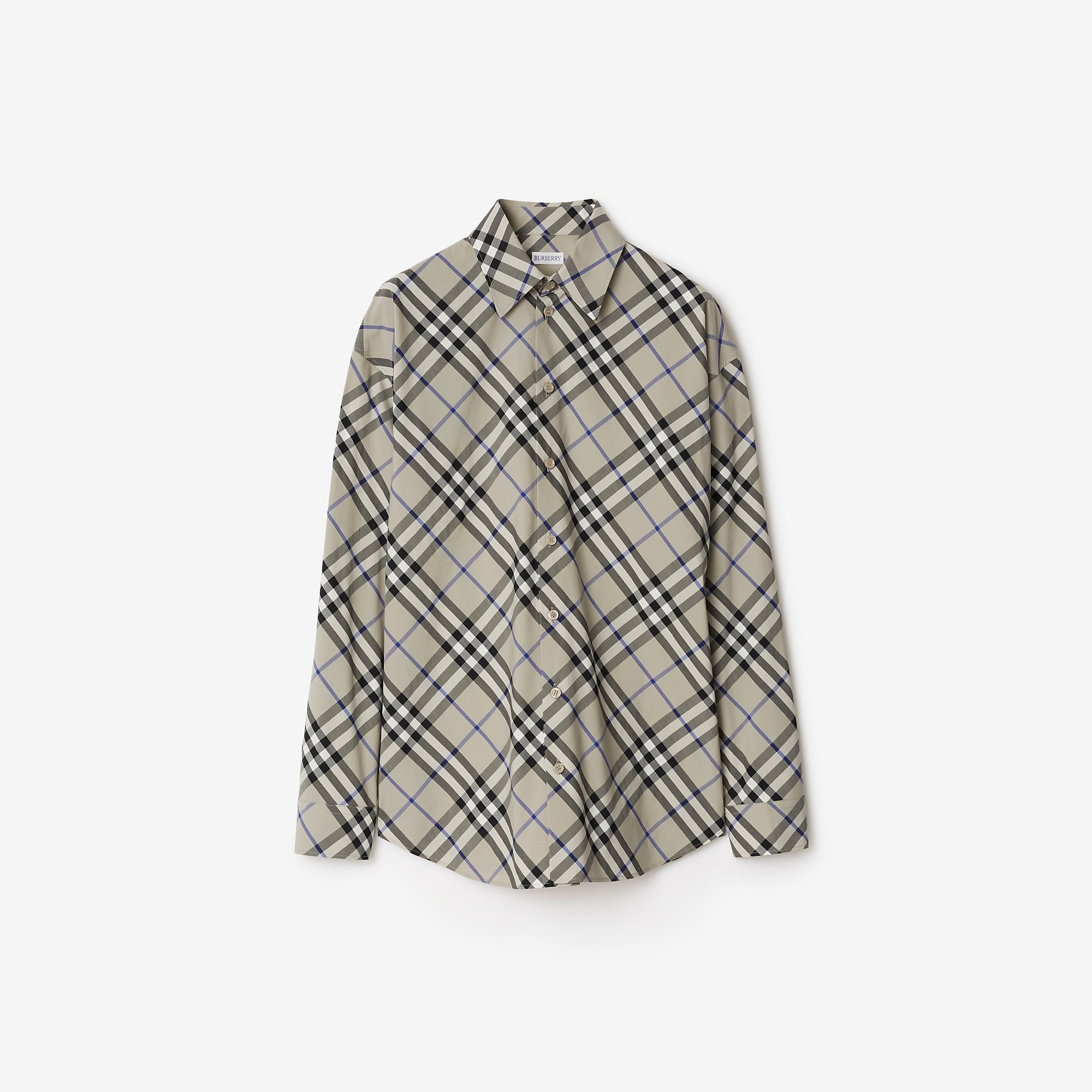 Product Details A long-sleeved shirt in cotton poplin, woven in Italy with the Burberry Check. The design is tailored to a relaxed fit. Part of Burberry Classics, wardrobe foundations with a unique Burberry slant. - Button closure - Point collar - Single-button cuffs - Curved hem - Relaxed fit: a looser cut than our regular fit. Consider taking a size down. - Machine wash - Item 80876421 Size & Fit - Length: 72cm/28.4in (size UK 6) - Model’s height: 180cm/5ft 11in. Model wears size UK 6 Fabric & Care - 100% cotton* - Buttons: mother-of-pearl - *100% of the cotton in the main material is organic - Imported