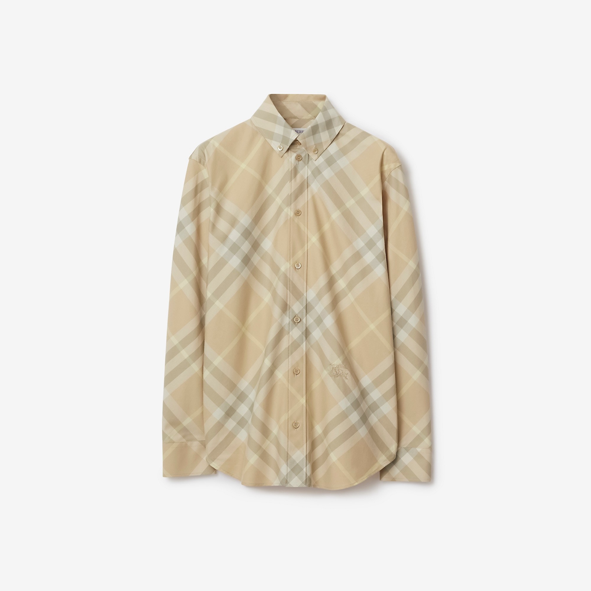 Product Details A point collar shirt in cotton twill, woven with the Burberry Check. The design is tailored to a relaxed fit and embroidered with the Equestrian Knight Design. - Button closure - Patch pocket - Curved hem - Embroidered Equestrian Knight Design at waist - Relaxed fit: a looser cut than our regular fit. Consider taking a size down. - Item 80835941 Size & Fit - Length: 72cm/28.4in (size UK 6) - Model’s height: 177cm/5ft 10in. Model wears size UK 6 Fabric & Care - 100% cotton - Buttons: mother-of-pearl - Specialist dry clean - Imported