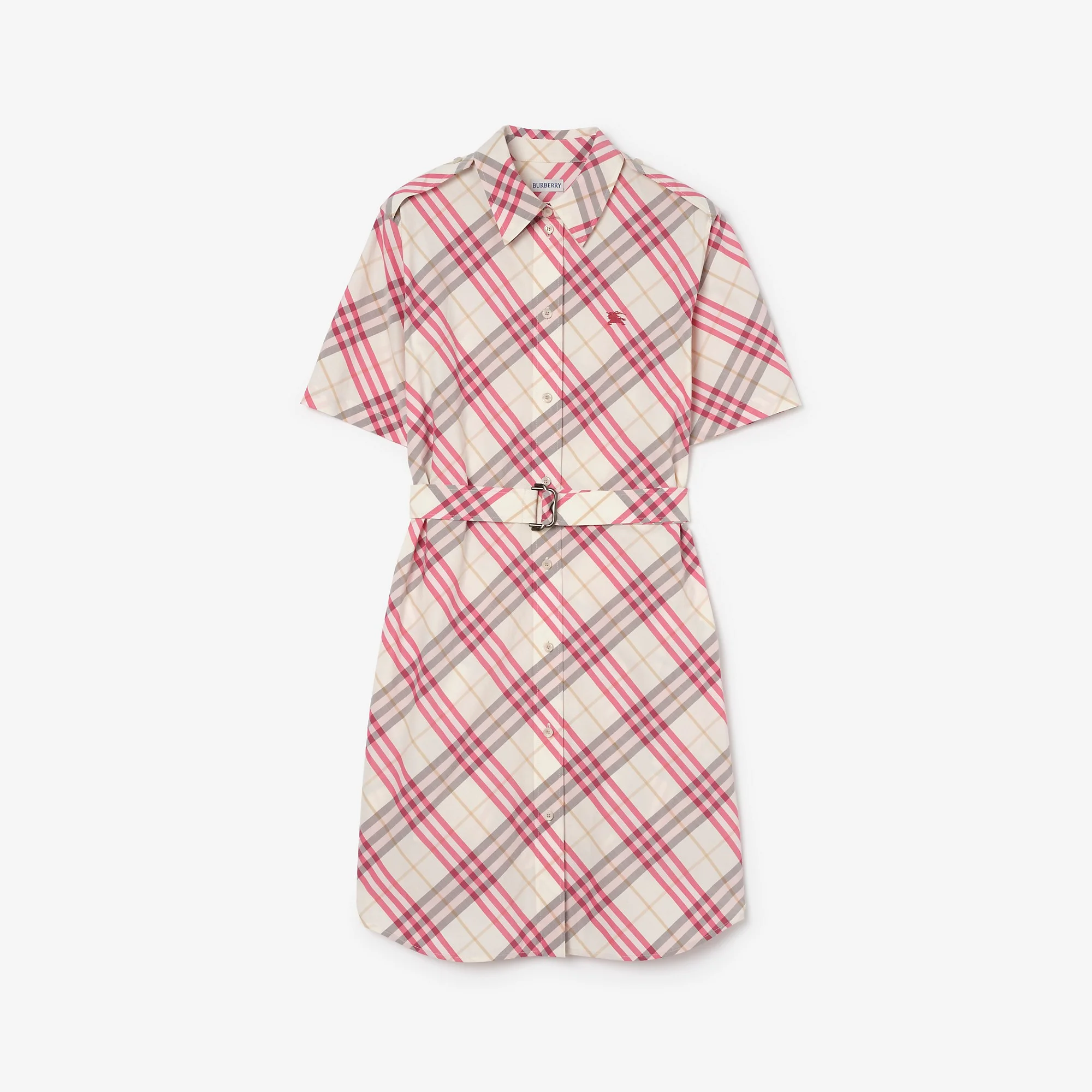Product Details Our signature Burberry Check shirt dress, refreshed in a seasonal aubergine purple. The short-sleeved style is tailored to a regular fit from soft cotton, woven with the iconic house code. Rainwear-inspired details include epaulettes and a B buckle belt to cinch the silhouette. - Item 81233111 Size & Fit - Regular fit. Fits true to size, take your normal size. - Length: 95cm/37.4in (size UK 6) - Model’s height: 178cm/5ft 10in. Model wears size UK 6 Fabric & Care - 100% cotton - Buttons: mother-of-pearl - Specialist dry clean - Imported