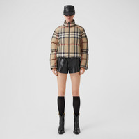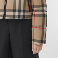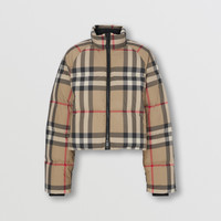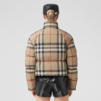 Product Details A cropped puffer jacket in Burberry Check, filled with goose down and feathers. - Two-way zip closure - Side zip pockets - Elasticated cuffs - Snow skirt - This item will be packaged in a recycled cotton tote unless the gift packaging option is selected at checkout. - Regular fit. Fits true to size, take your normal size. - Machine wash - Item 80590931 Size & Fit - Length: 52cm/20.5in (size UK S) - Model’s height: 179cm/5ft 10in. Model wears size UK S Fabric & Care - Outer: 100% polyester* - Trims: 87% polyester, 13% cotton; 95% wool, 4% polyamide, 1% elastane - Lining: 100% polyamide - Filling: 90% goose down, 10% goose feathers - Wadding: 100% polyester - *The main material of this product is made with at least 70% recycled content - Imported