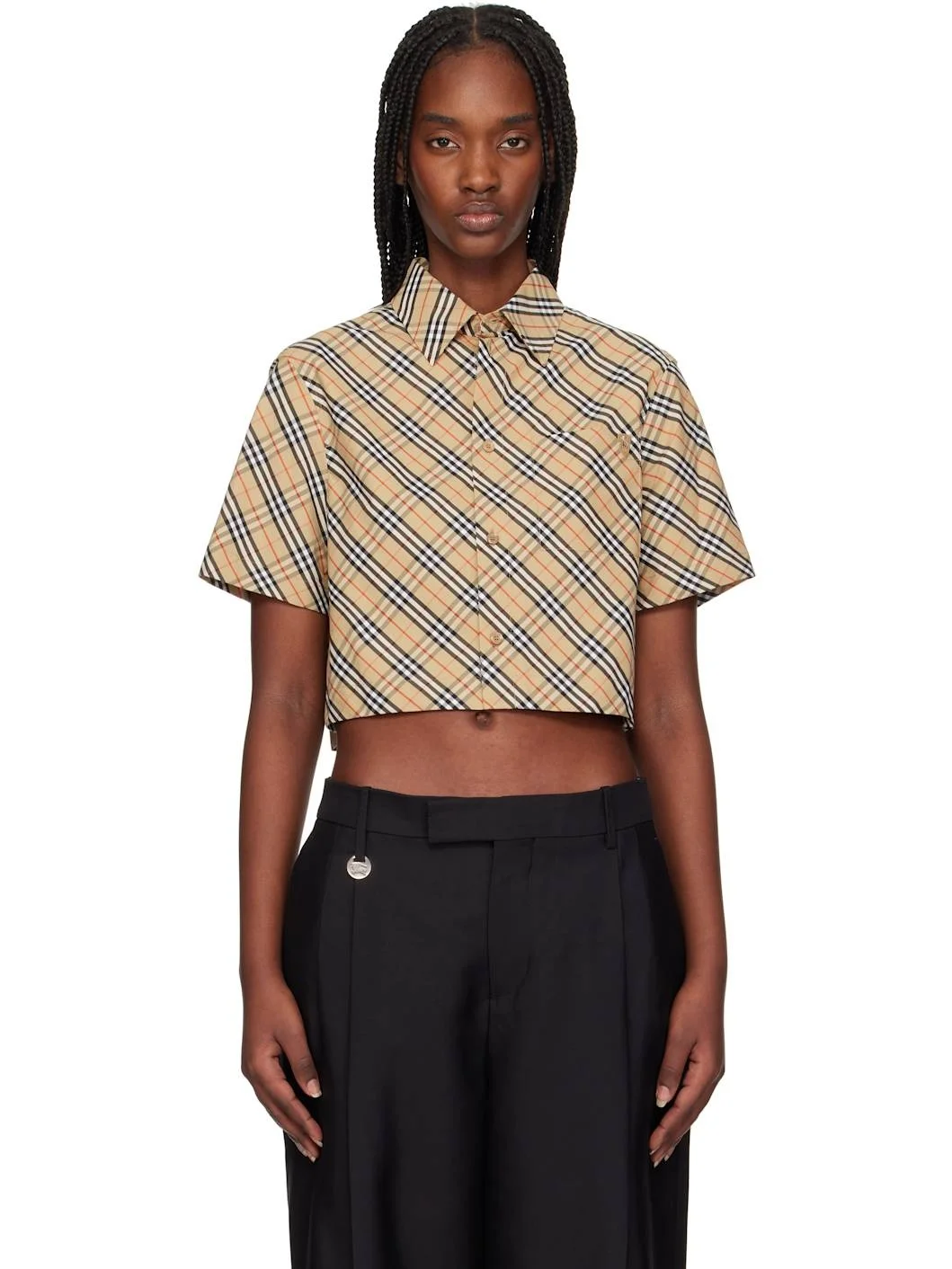 Beige Cropped Check Cotton Shirt
