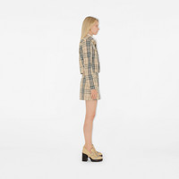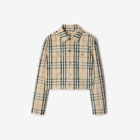 Product Details A cropped jacket made in Italy from denim woven with the Burberry Check. The style features a suede patch with our B shield motif at the back. - Button closure - Chest button flap pockets - Single-button cuffs - Suede patch with B shield at waistband - Comes with a garment bag - Machine wash inside out - Item 80975421 Size & Fit - Length: 47cm/18.5in (size UK S) - Model’s height: 177cm/5ft 10in. Model wears size UK S Fabric & Care - Outer: 100% cotton - Trims: 100% calf leather; 100% calf suede - Lining: 100% cotton - Made in Italy
