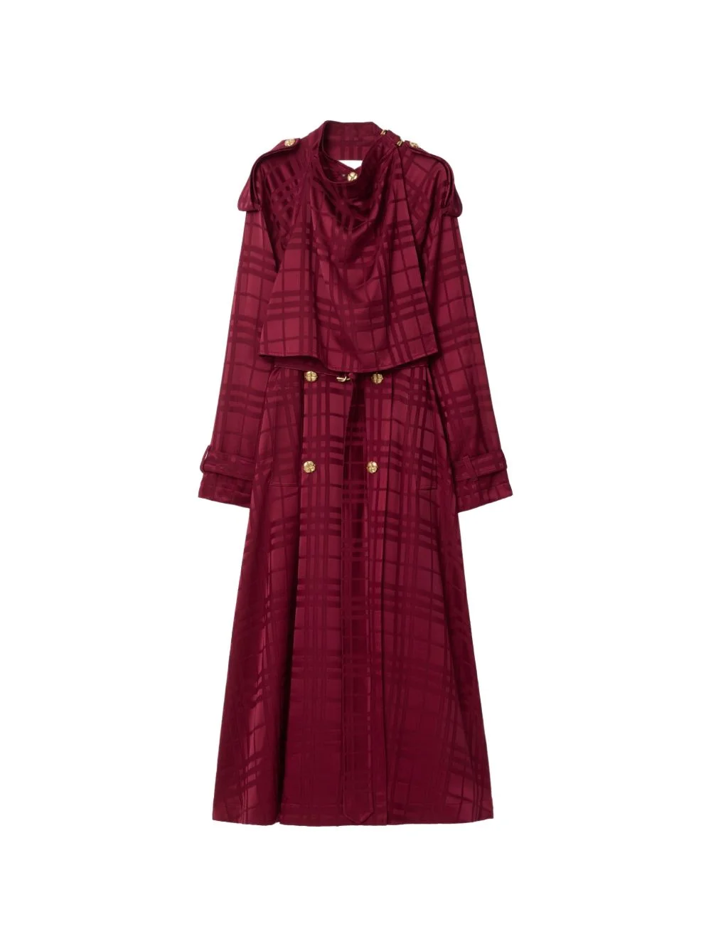 check double-breasted silk trench coat Highlights - Ripple red - Check pattern - Epaulettes - Storm shield at back - Gun flap at front - Buckle belt - Side welt pockets - Back vent Made in Italy Composition Silk 100% Washing instructions Read Manufacturer Guidelines