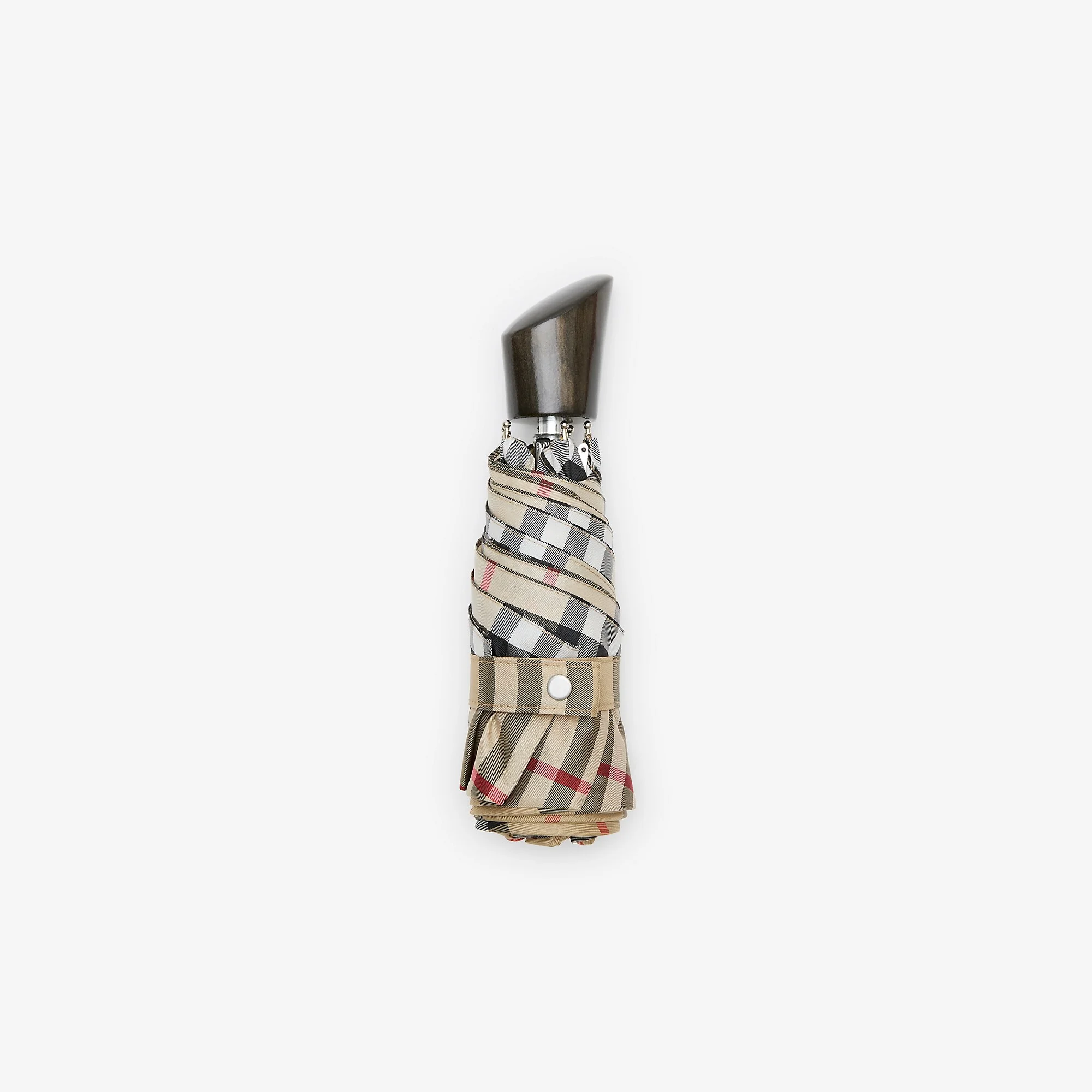 Product Details A folding umbrella woven with the Burberry Check. The compact style is finished with a smooth wooden handle and metal cap engraved with our Equestrian Knight Design. - Press-stud closure - Comes with coordinating zip pouch - Item 81220321 Size & Fit - Length: 59cm/23.2in. Folded length: 23cm/9.1in. Diameter: 100cm/39.4in Fabric & Care - Main: 100% polyester - Handle: 100% maple wood - Frame: 75% iron, 25% aluminium - Imported