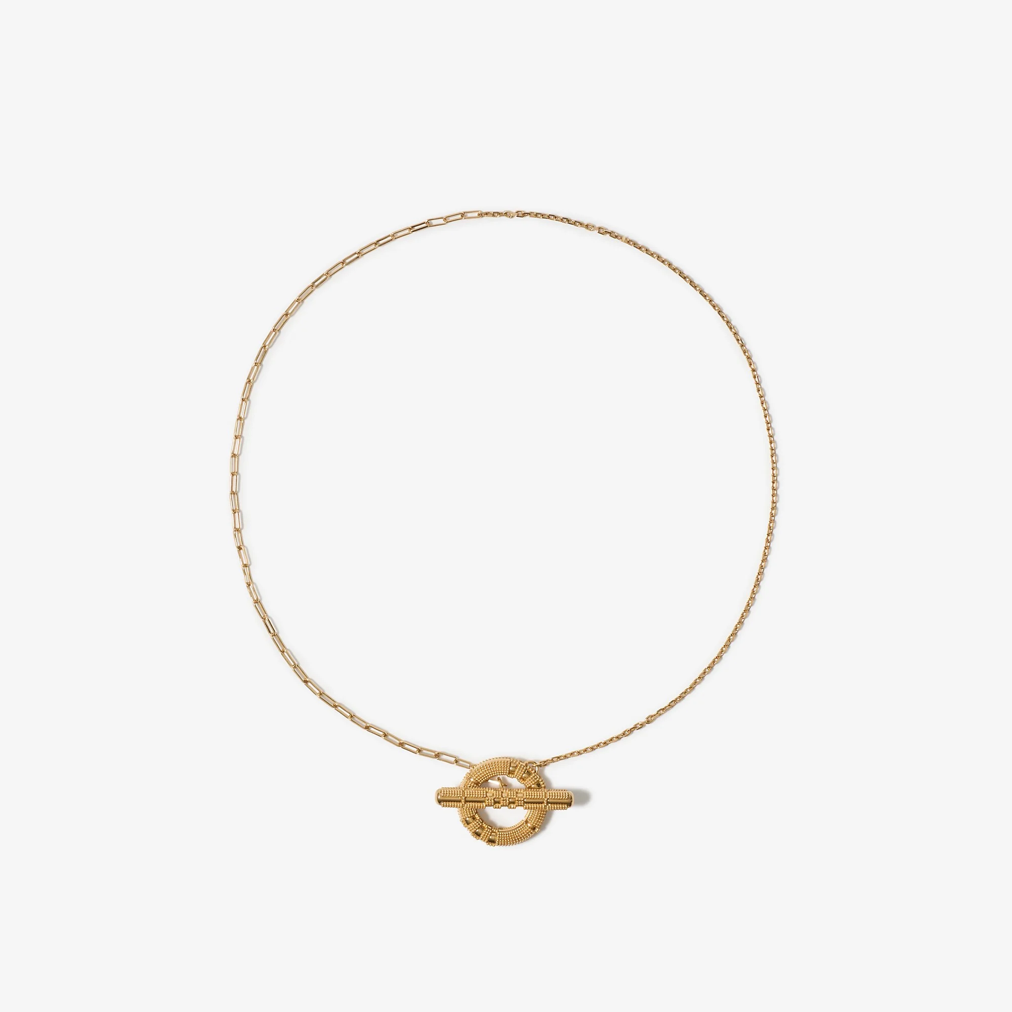 Product Details A gold-plated necklace crafted in Italy with chain links in contrasting sizes. Inspired by the ancient granulation technique, tiny spheres of metal are intricately soldered onto the medallion and T-bar fastening to form a tactile check pattern. - Engraved Burberry lettering at T-bar - Comes with a dust bag - Item 81202331 Size & Fit - Length: 52cm/20.5in Fabric & Care - 100% brass with gold plating - Made in Italy