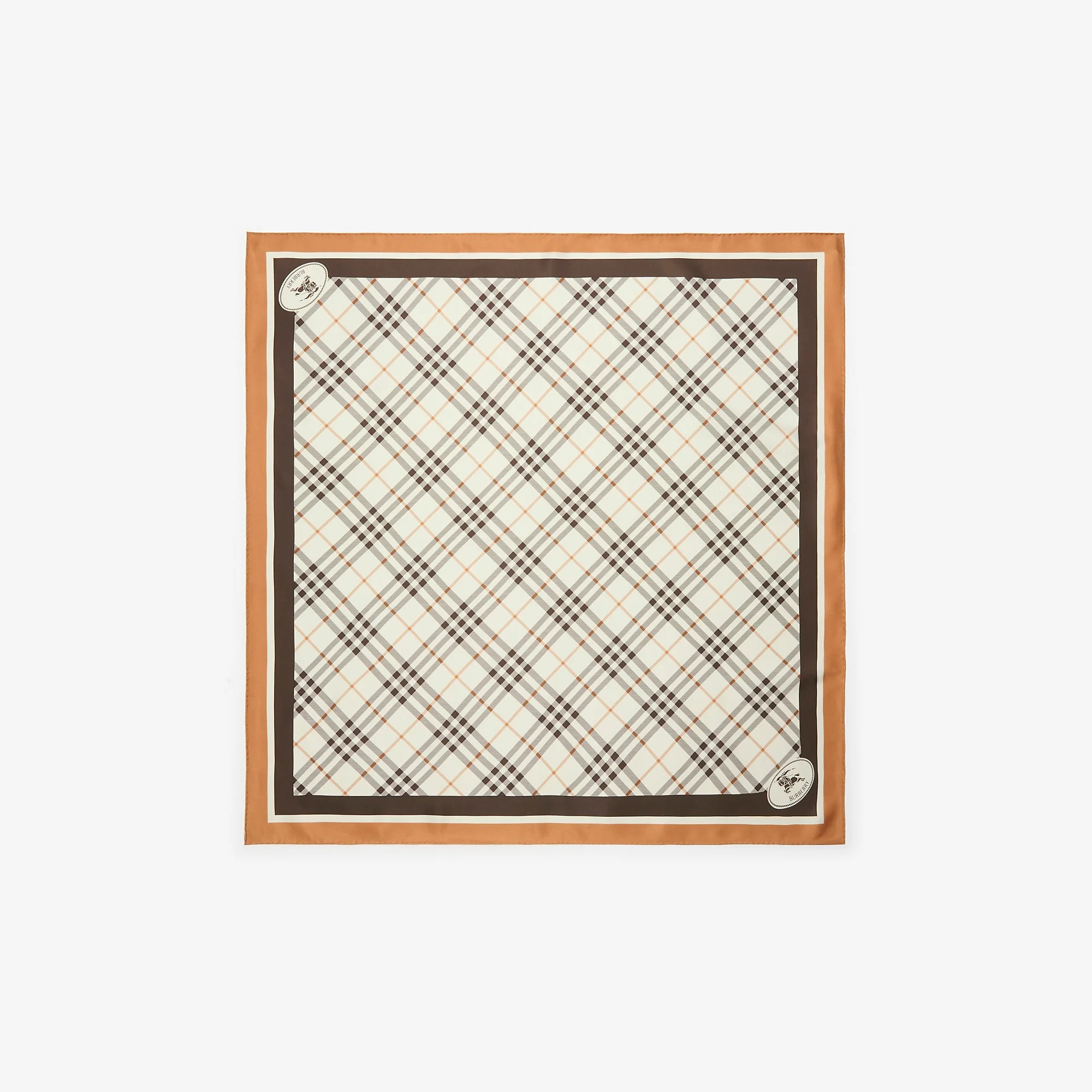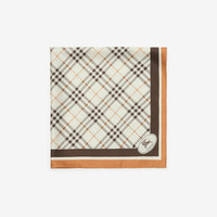 Product Details A square scarf made in Italy from silk twill, printed with the Burberry Check. The design is framed with contrasting stripes and our Knight stamp, an archival motif first seen on Burberry bags in the 1980s. - Square - Hand-rolled edges - Printed Burberry lettering at corners - Item 81203191 Size & Fit - 90 x 90cm/35.4 x 35.4in Fabric & Care - 100% silk - Specialist dry clean - Made in Italy