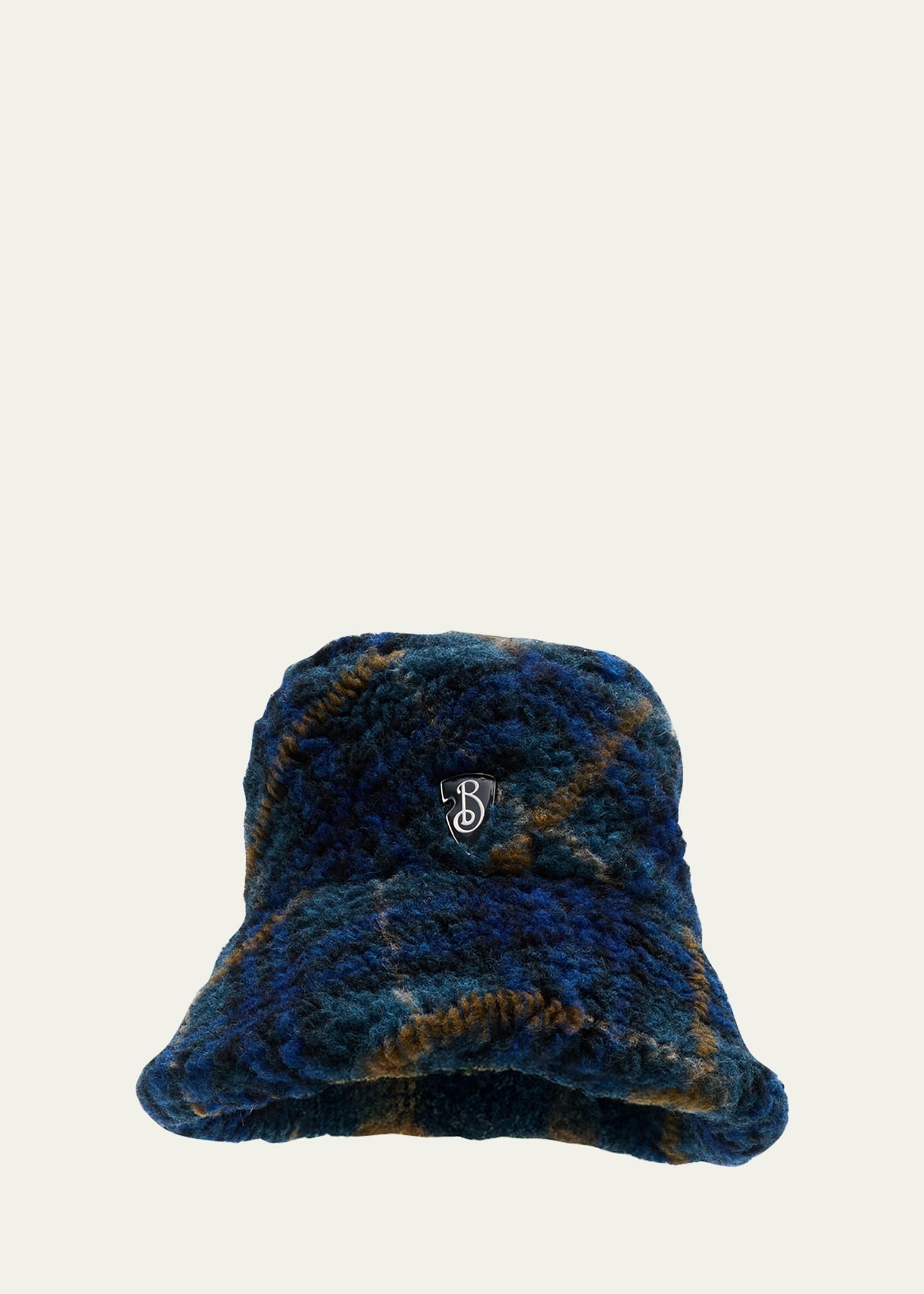 Burberry fleece bucket hat in soft knitted check wool, polyester, and acrylic Metal B shield motif inspired by the brand's equestrian knight design Flat crown Downturned brim Made in Italy Online Inquiries: BGS21_D53KJ| Store Inquiries: #4935577