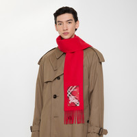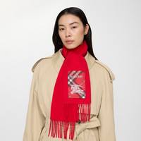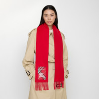 Product Details A cashmere scarf in a seasonal crayon red – created as part of our Year of the Horse capsule. Woven on traditional looms at a Scottish mill founded in 1797, the fabric is washed in local spring water and receives two further washes for an ultra-soft finish and fuller texture. Reworking the label from our signature trench coats, the style features an appliqued patch woven with the Burberry Check, logo and Equestrian Knight Design. - Rectangular - Fringing at both ends - Appliqued Burberry Check label - Item 81187431 Size & Fit - 168 x 15cm/66.1 x 5.9in Fabric & Care - 100% cashmere - Specialist dry clean - Made in Scotland
