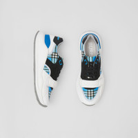 PRODUCT DETAILS Our chunky sneaker reworked in check, leather and suede. The design is set on an accentuated, curved sole. Upper: 46% polyester, 30% calf leather, 14% calf suede, 10% rubber Lining: 50% polyester, 50% sheep leather Sole: 100% rubber Lace-up and Velcro tab closure Raised Burberry lettering at heel and strap Made in Italy 80395871