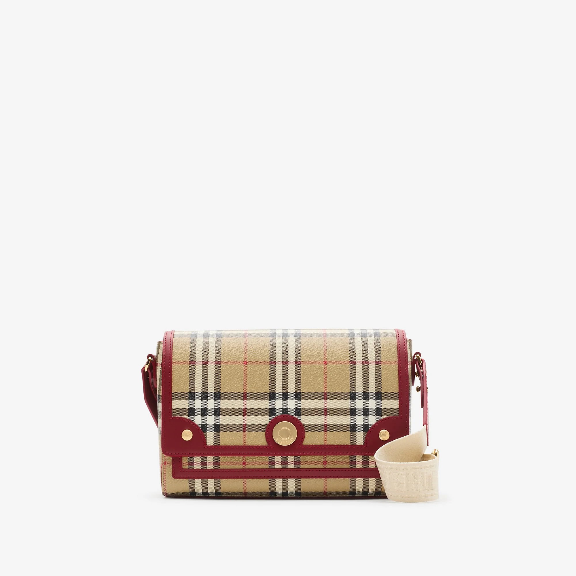 Product Details An archive-inspired crossbody bag made in Italy from a coated cotton blend printed with the Burberry Check and lined in cotton. The Note is trimmed with smooth calf leather and has a logo-engraved closure. Carry across the body or wear on the shoulder using the detachable strap. - Detachable, adjustable webbing strap - Foldover flap with magnetic closure - Exterior slip pocket, interior slip pocket - Hand-painted edges - Polished metal hardware - Cotton lining - Comes with a dust bag - Item 81162851 Size & Fit - 25 x 8.5 x 18cm/9.8 x 3.3 x 7.1in. Min. strap drop: 39cm/15.4in. Max. strap drop: 59cm/23.2in Fabric & Care - Outer: 55% polyurethane, 25% polyester, 20% cotton - Trim: 100% calf leather - Lining: 100% cotton - Made in Italy