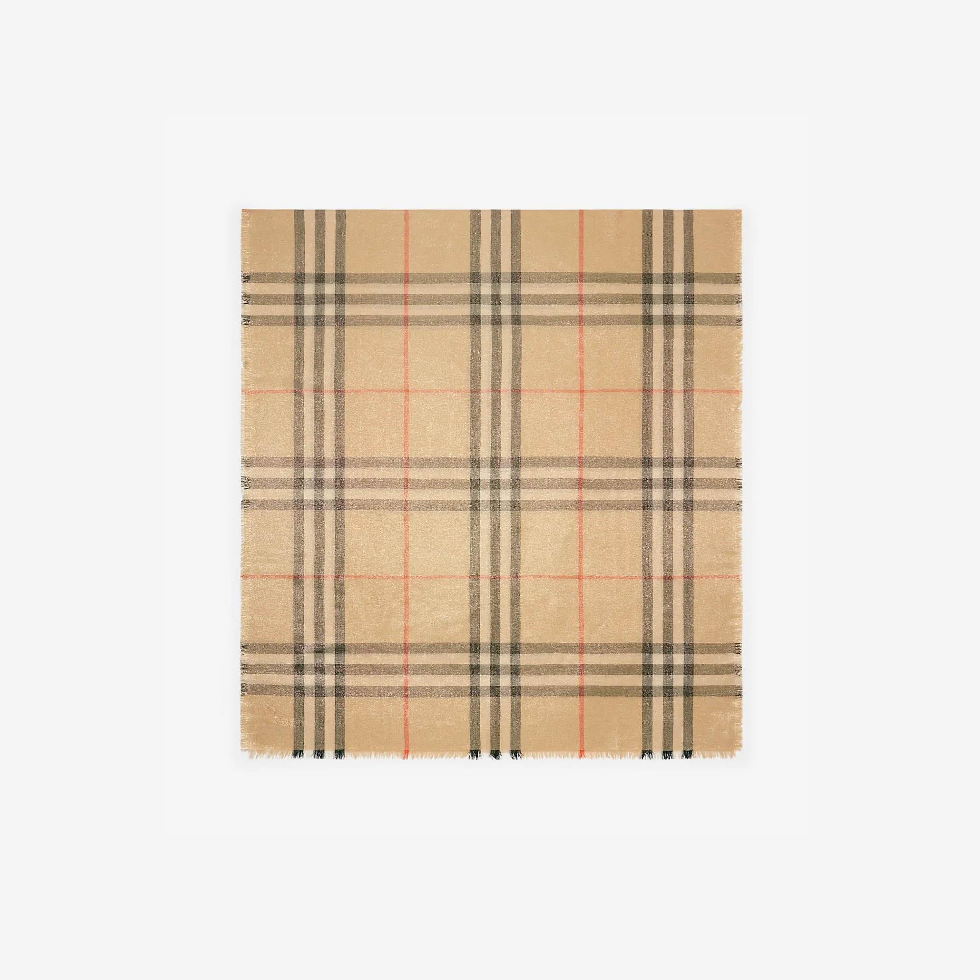Product Details A lightweight Burberry Check scarf made in Italy from wool and silk woven with metallic fibres for a subtle shimmering finish. - Rectangular - Eyelash fringing at the edges - Item 81060631 Size & Fit - 200 x 90cm/78.7 x 35.4in Fabric & Care - 79% wool, 14% silk, 7% metallic fibre - Dry clean - Made in Italy