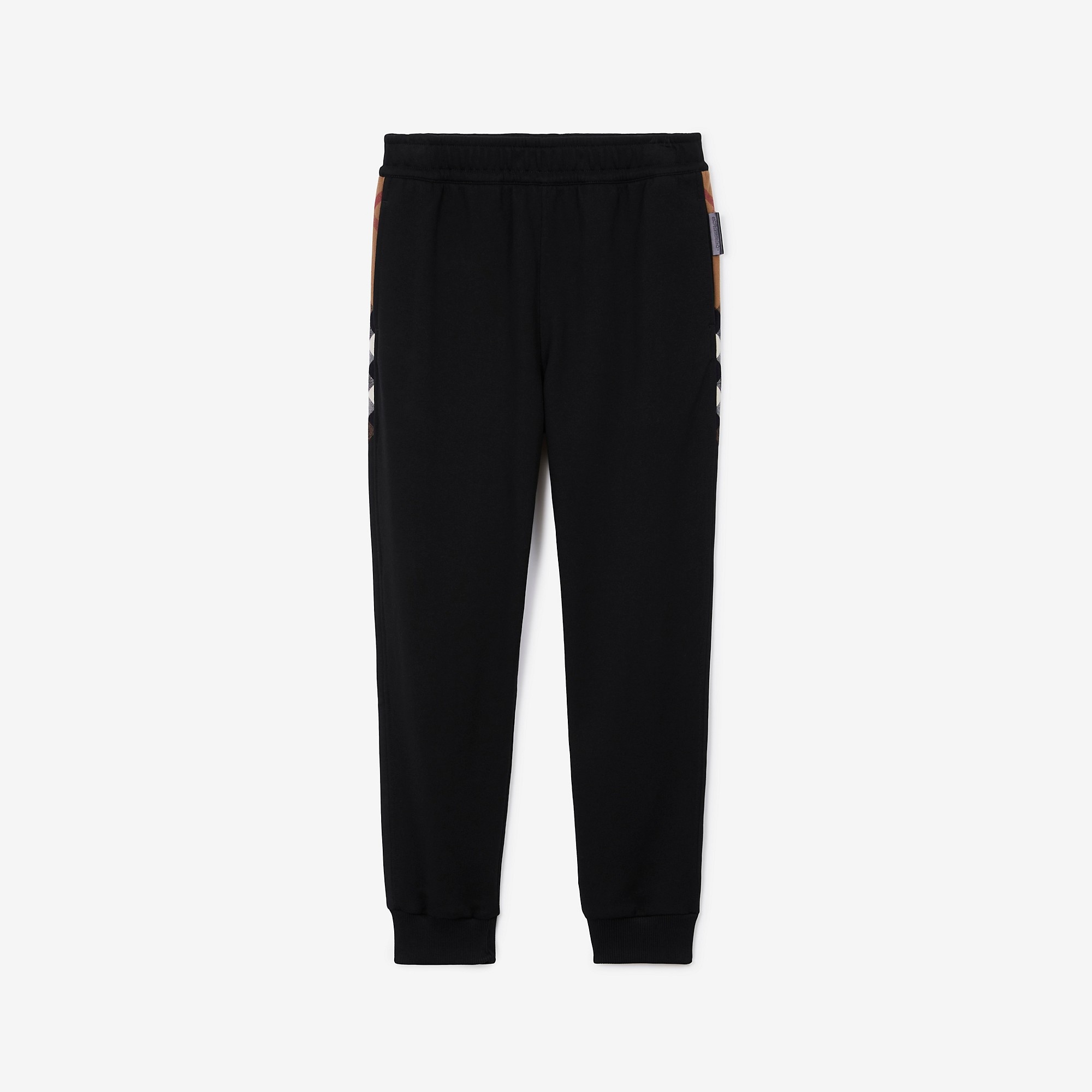 Product Details Jogging pants in loop-back cotton jersey with Burberry Check side panels. The drawcord style is cut to a regular fit. - Interior drawcord waist - Side slip pockets, back welt pocket - Leather tab with Burberry lettering at pocket - Regular fit. Fits true to size, take your normal size. - Machine wash - Item 80460561 Size & Fit - Inside leg length: 69cm/27.2in (size UK S) - Model’s height: 177cm/5ft 10in. Model wears size UK S Fabric & Care - 100% cotton - Panels: 100% cotton - Trims: 98% cotton, 2% elastane; 100% calf leather - Pocket lining: 100% cotton - Made in Portugal