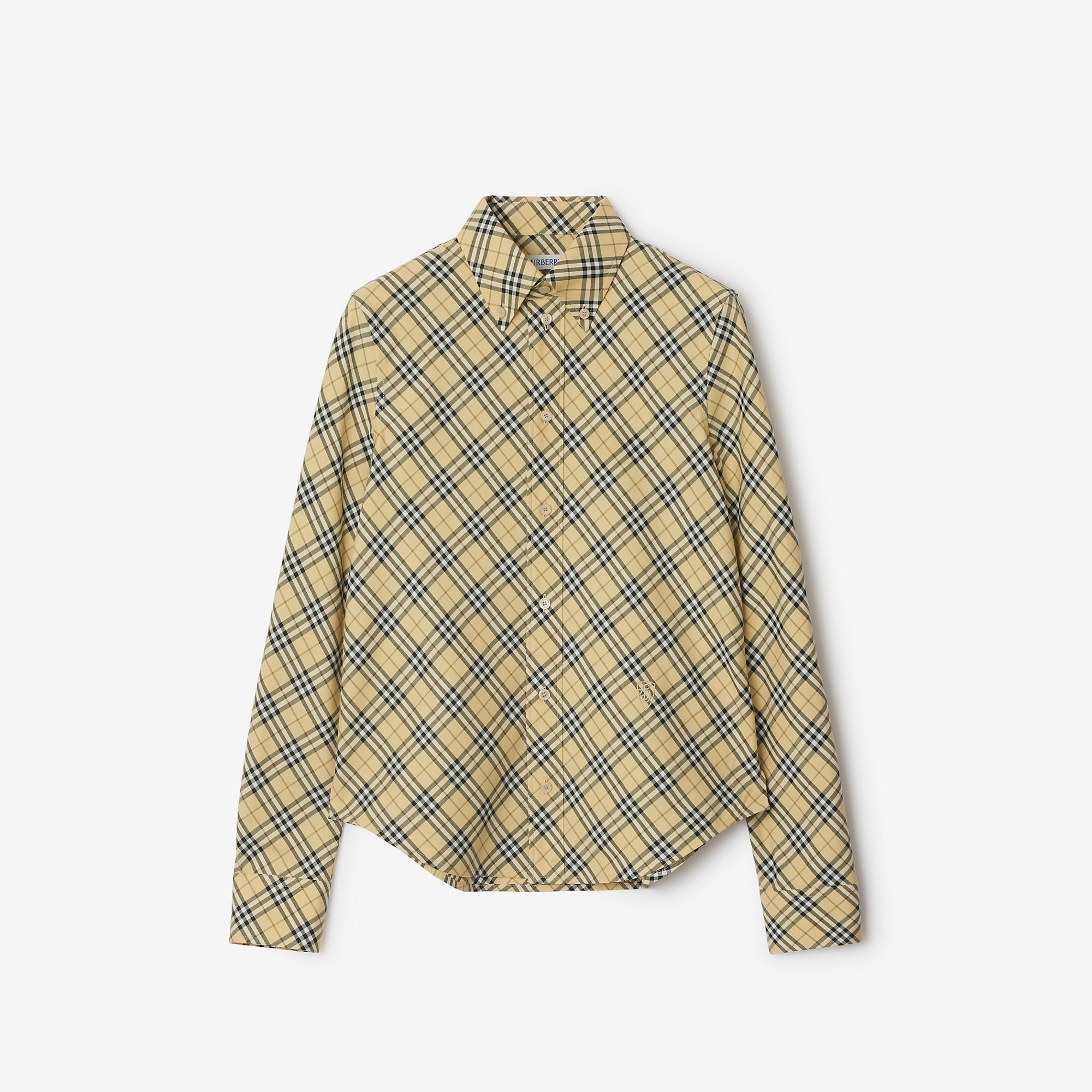 Product Details A shirt made from Italian-woven washed cotton twill, patterned with the Burberry Check. Tailored to a slim fit with a shorter length, the style is embroidered with our B shield – a motif inspired by the Equestrian Knight Design. - Button closure - Button-down collar - Single-button cuffs - Curved hem - Embroidered B shield at front - Slim fit: this style is cut to a fitted silhouette. Fits true to size, take your normal size. - Item 80982551 Size & Fit - Length: 64cm/25.2in (size UK S) Fabric & Care - 100% cotton - Buttons: mother-of-pearl - Specialist dry clean - Imported