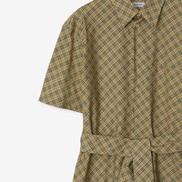 Product Details A belted shirt dress made from lightweight cotton poplin with a soft feel. The design is woven with a miniature Burberry Check and cut to a regular fit. - Button closure - Point collar - Chest patch pocket - Self-tie belt - Straight hem - Regular fit. Fits true to size, take your normal size. - Machine wash - Item 80943571 Size & Fit - Length: 96cm/37.8in (size UK 6) - Model’s height: 178cm/5ft 10in. Model wears size UK 6 Fabric & Care - 100% cotton - Buttons: mother-of-pearl - Imported