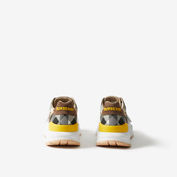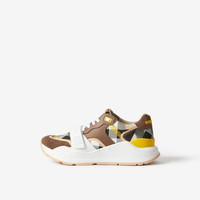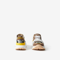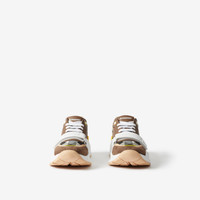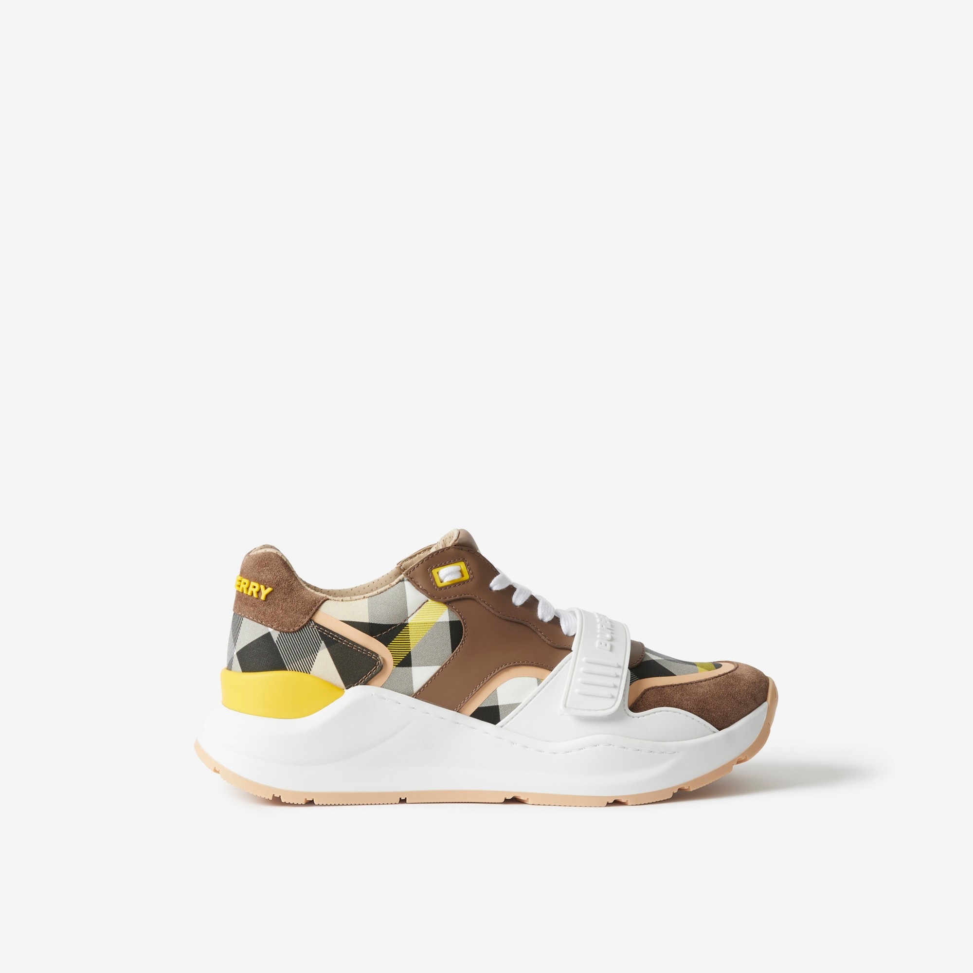 PRODUCT DETAILS Our chunky sneaker reworked in a tonal clash of Burberry Check cotton, leather and suede. The design is tagged with our logo and set on an accentuated, curved sole. Upper: 60% cotton, 25% calf leather, 15% calf suede Trim: 50% rubber, 30% polyester, 10% polyamide, 10% zinc alloy Lining: 90% sheep leather, 10% goat leather Sole: 100% rubber Lace-up and Velcro-tab closure Raised Burberry lettering at strap and heel, printed Burberry lettering at tongue Made in Italy Item 80635041