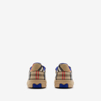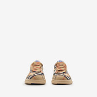 Product Details Italian-made sneakers in a cotton blend woven with the Burberry Check. The mesh-lined style features check laces and rubber soles moulded with archive Burberry lettering. Part of Burberry Classics, wardrobe foundations with a unique Burberry slant. - Rounded toe - Equestrian Knight Design label at tongue - Leather insole - Burberry lettering at sole - Comes with a dust bag - Item 80953721 Fabric & Care - Upper: 65% polyester, 35% cotton* - Trim: 70% polyester, 30% brass - Lining: 38% polyester, 34% calf leather, 21% sheep leather, 7% goat suede - Sole: 100% thermoplastic polyurethane* - *The main material and the sole of this product are made with at least 50% recycled content - Made in Italy