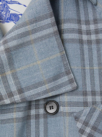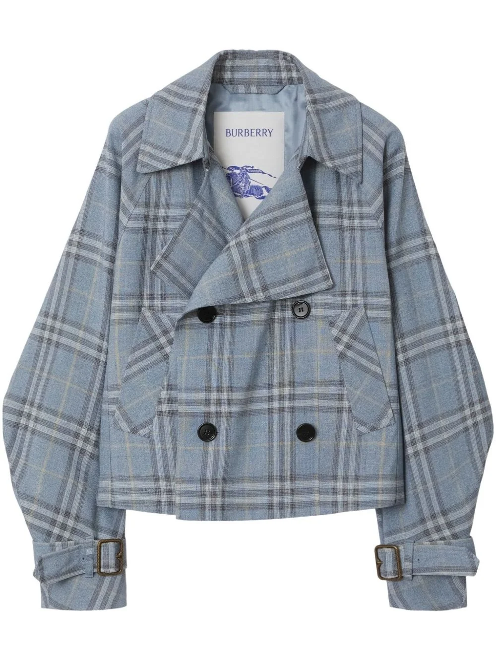 check trench jacket Highlights - Ice blue - Double-breasted button fastening - Belted cuffs - Two side welt pockets - Long sleeves Made in United Kingdom Composition Outer: Buffalo Horn 100%, Viscose 58%, Silk 42% Lining: Viscose 100%