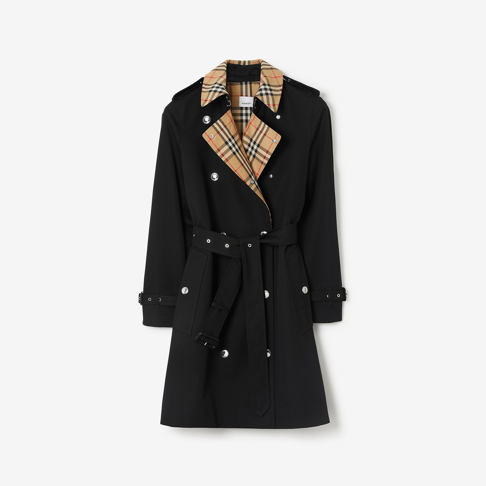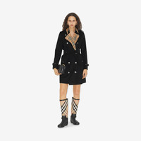 PRODUCT DETAILS A trench coat in shower-resistant gabardine, woven at the Burberry mill. Inside and at the collar is Burberry Check cotton, used to line our coats since the 1920s. The press-stud style is cut to a regular fit with set-in sleeves. - Length: 90cm/35.4in (size UK 6) - Model’s height: 177cm/5ft 10in. Model wears size UK 6 Regular fit Outer: 100% cotton* Panels: 100% cotton Lining: 100% cotton Sleeve lining: 100% viscose Specialist dry clean Imported *Containing organic cotton Item 80728011