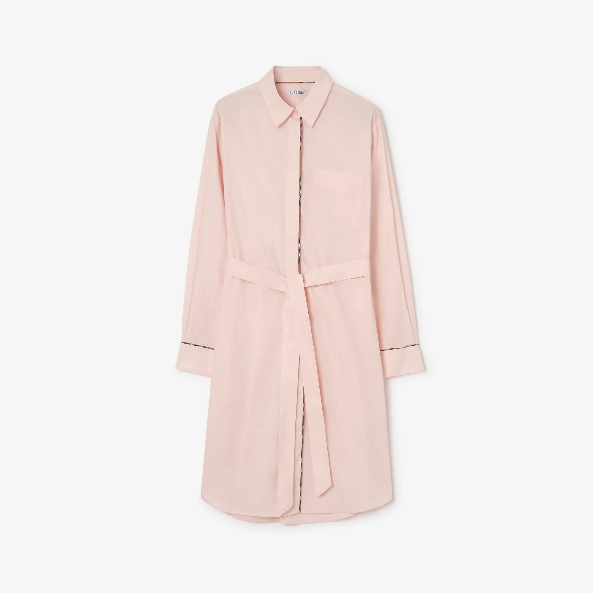 Product Details A cotton shirt dress edged with Burberry Check piping at the placket and cuffs. The style comes with a self-tie belt to adjust the waist. - Button closure - Point collar - Chest patch pocket - Single-button cuffs - Curved hem - Item 81217581 Size & Fit - Length: 106cm/41.7in (size UK 8) Fabric & Care - 100% cotton - Specialist dry clean - Imported