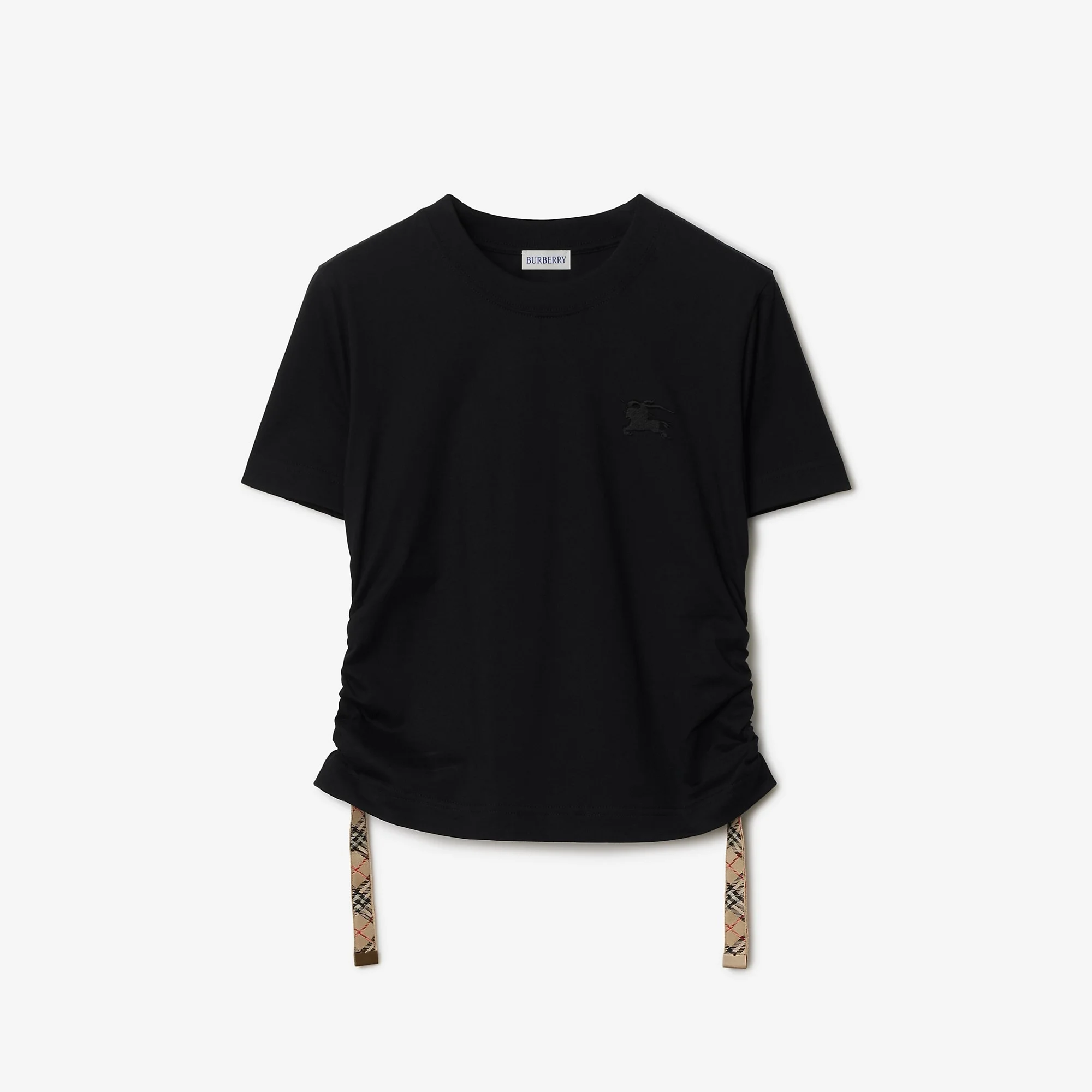 Product Details A T-shirt in lightweight cotton jersey, cut to a regular fit and embroidered with a tonal Equestrian Knight Design. The ruched sides can be adjusted with the Burberry Check side straps and B buckles. - Rib-knit neckline - Embroidered Equestrian Knight Design at chest - Regular fit. Fits true to size, take your normal size. - Machine wash - Item 81091871 Size & Fit - Length: 55cm/21.7in (size UK S) - Model’s height: 177cm/5ft 10in. Model wears size UK S Fabric & Care - 100% cotton - Trims: 97% cotton, 3% elastane; 100% polyester - Made in Portugal