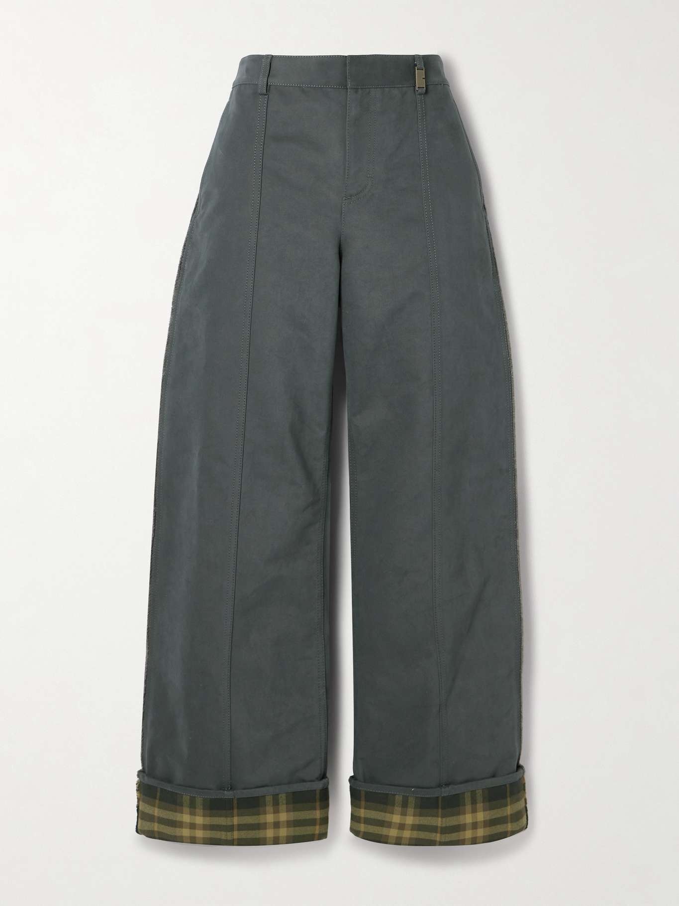 EDITORS'NOTES Burberry's wide-leg pants are made from brushed cotton-blend and have folded cotton-twill cuffs that feature the house's signature checks. They're designed to sit high on the waist and are left unfinished along the seams. SIZE & FIT Model measurements: - Fits true to size, take your normal size - High-rise, cut for a wide-leg fit - Rigid, non-stretchy fabric - Model is 175cm/ 5'9" and is wearing a UK 8 - Bust: 79cm/ 31" - Waist: 61cm/ 24" - Hip: 89cm/ 35" DETAILS & CARE - Charcoal brushed cotton-blend, tonal-green cotton-twill - Concealed hook, button and zip fastening at front - 75% cotton, 25% polyamide; trim: 100% cotton; buttons: 100% horn (Buffalo); pocket lining: 100% cotton - Dry clean