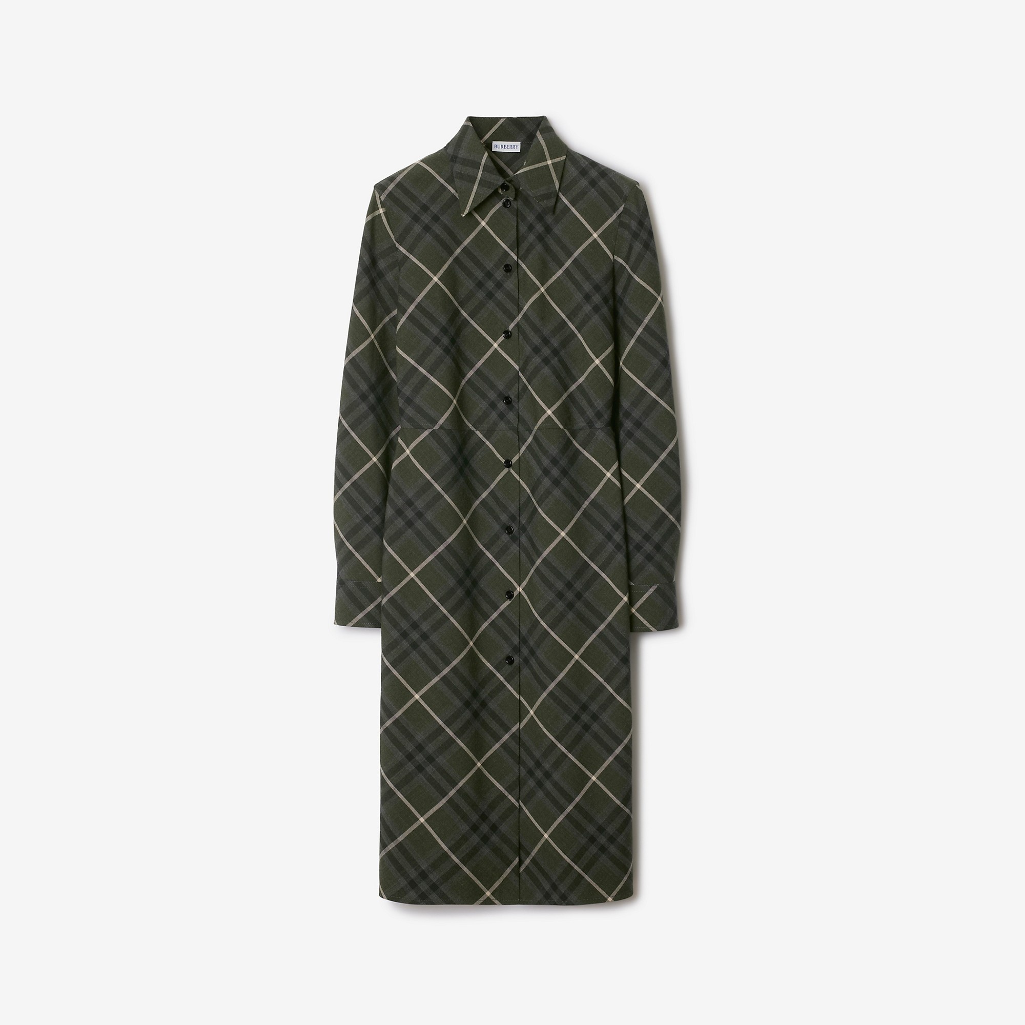Product Details A shirt dress in an Italian-woven wool blend, patterned with the Burberry Check. The style is cut to a slim fit and embroidered with a tonal B charm motif below the waist. - Button closure - Point collar - Single-button cuffs - Slim fit: this style is cut to a fitted silhouette. Fits true to size, take your normal size. - Item 80975351 Size & Fit - Length: 105cm/41.3in (size UK 8) - Model’s height: 177cm/5ft 10in. Model wears size UK 8 Fabric & Care - 55% polyester, 45% wool - Buttons: mother-of-pearl - Specialist dry clean - Imported