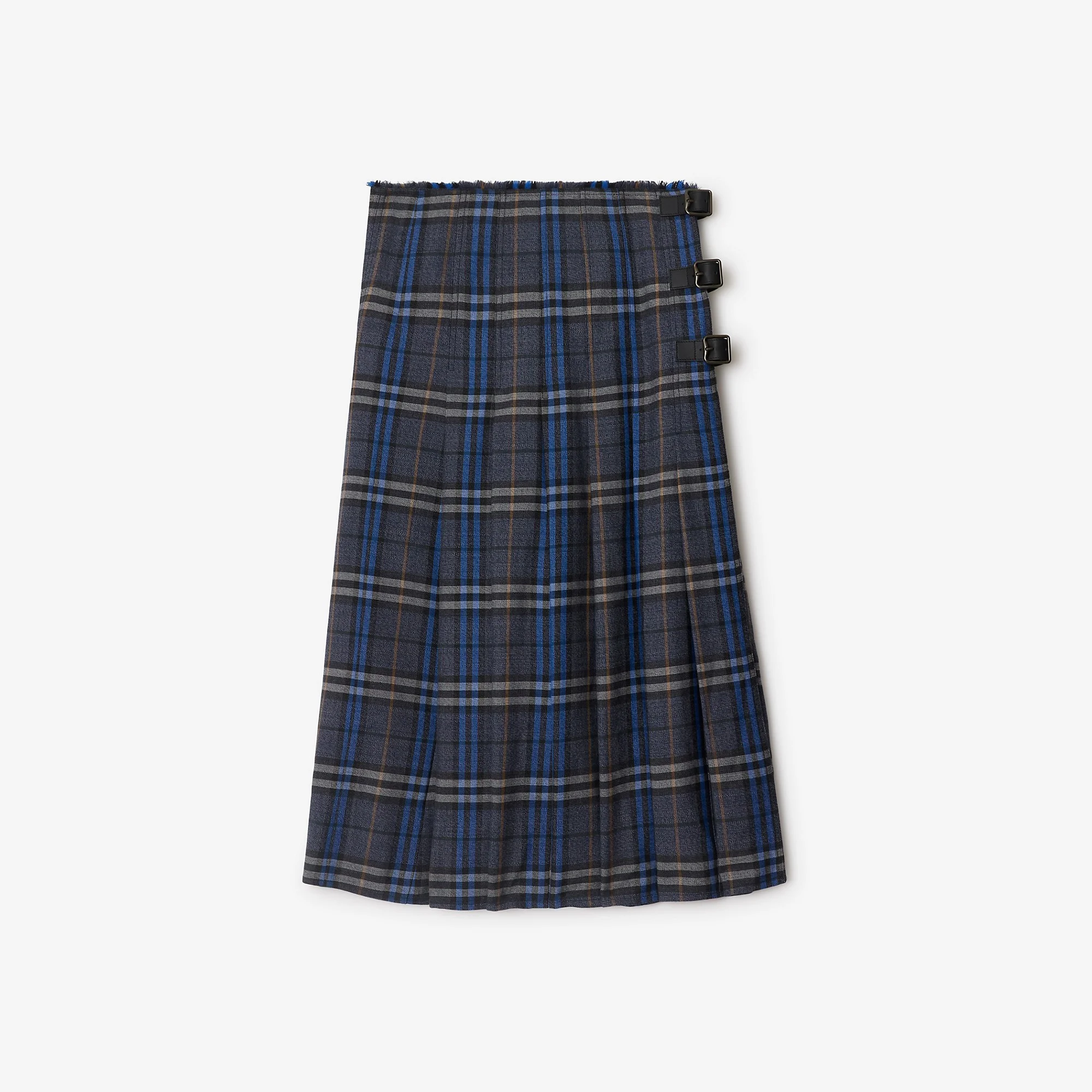 Product Details A kilt made from wool woven with the Burberry Check. The A-line silhouette is tailored with pleats and can be adjusted with the calf leather B buckle straps. - Side button and B buckle closure - Eyelash fringing at the waistband - Item 81104291 Size & Fit - Length: 85cm/33.5in Fabric & Care - 100% wool - Trim: 100% calf leather - Buttons: buffalo horn - Specialist dry clean - Imported