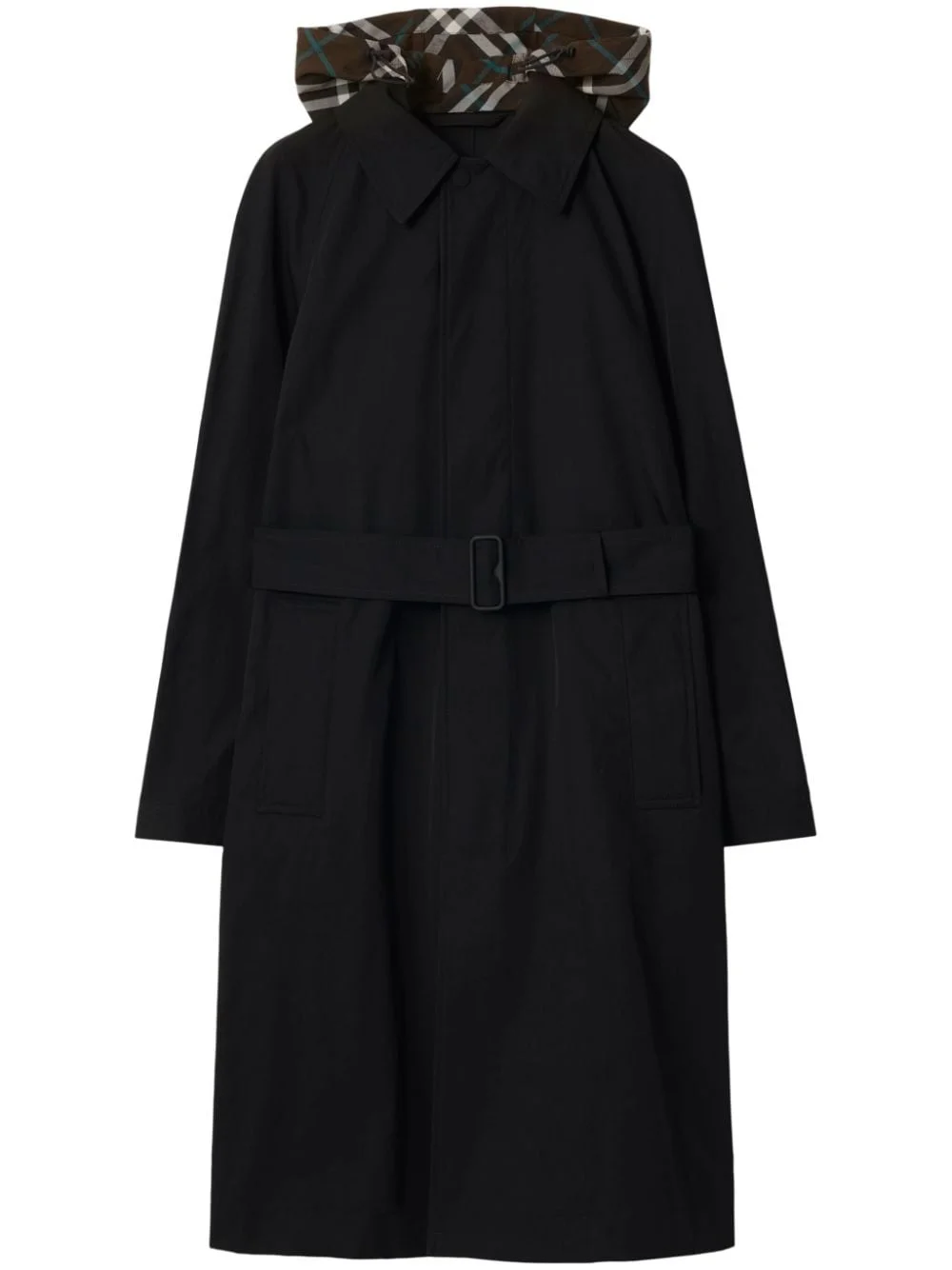 concealed-hood raincoat Highlights - Black - Water-repellent - Concealed hood - Classic collar - Concealed front press-stud fastening - Detachable and adjustable waist belt - Belt loops - Long sleeves - Two side welt pockets - Below-knee length - Straight hem Imported Composition Polyester 100%, Polyamide 68%, Cotton 32% Washing instructions Dry Clean Only