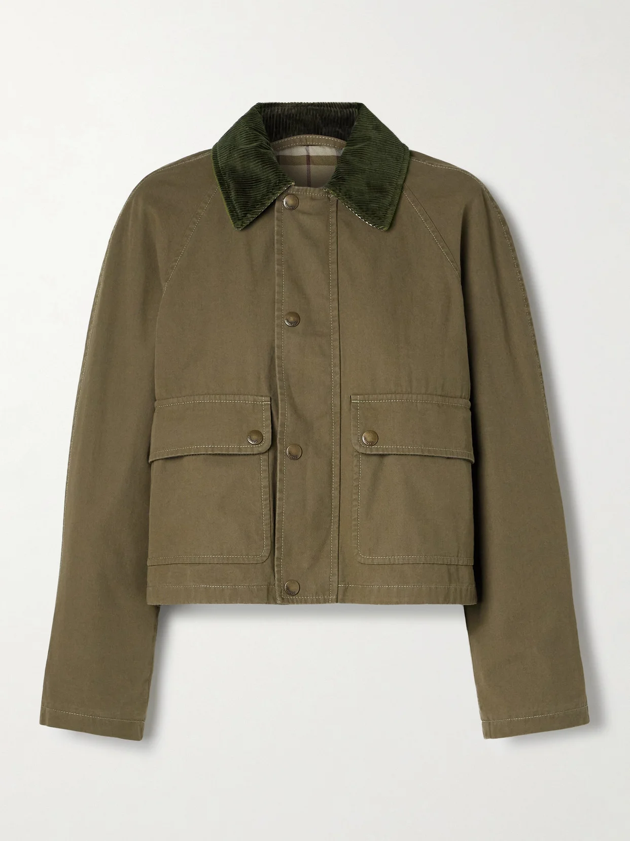 Made from weighty cotton-twill, Burberry's jacket is cut for a boxy fit and trimmed with a corduroy pointed collar. Balance the short hem with high-rise pants and roll the cuffs to show off the classic checked lining.