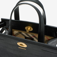Product Details A timeless Cotswolds tote made in Italy from crocodile-effect leather, lined in a cotton blend woven with the Burberry Check in signature sand beige. The compact style is detailed with a check-engraved closure and D-ring hardware inspired by the belt from our iconic trench coats. Carry in hand or as a shoulder bag using the strap. - Top handles - Detachable, adjustable strap - Twist-lock closure - Side adjusters - Interior zip pocket - Hand-painted edges - Brushed metal hardware - Embossed Burberry lettering at front - Burberry Check lining - Comes with a dust bag - Item 81188961 Size & Fit - 24.5 x 13 x 19.5cm/9.7 x 5.1 x 7.7in. Min. strap drop: 42cm/16.5in. Max. strap drop: 52cm/20.5in Fabric & Care - Outer: 100% lambskin - Trim: 100% lambskin - Lining: 51% cotton, 49% polyester - Made in Italy