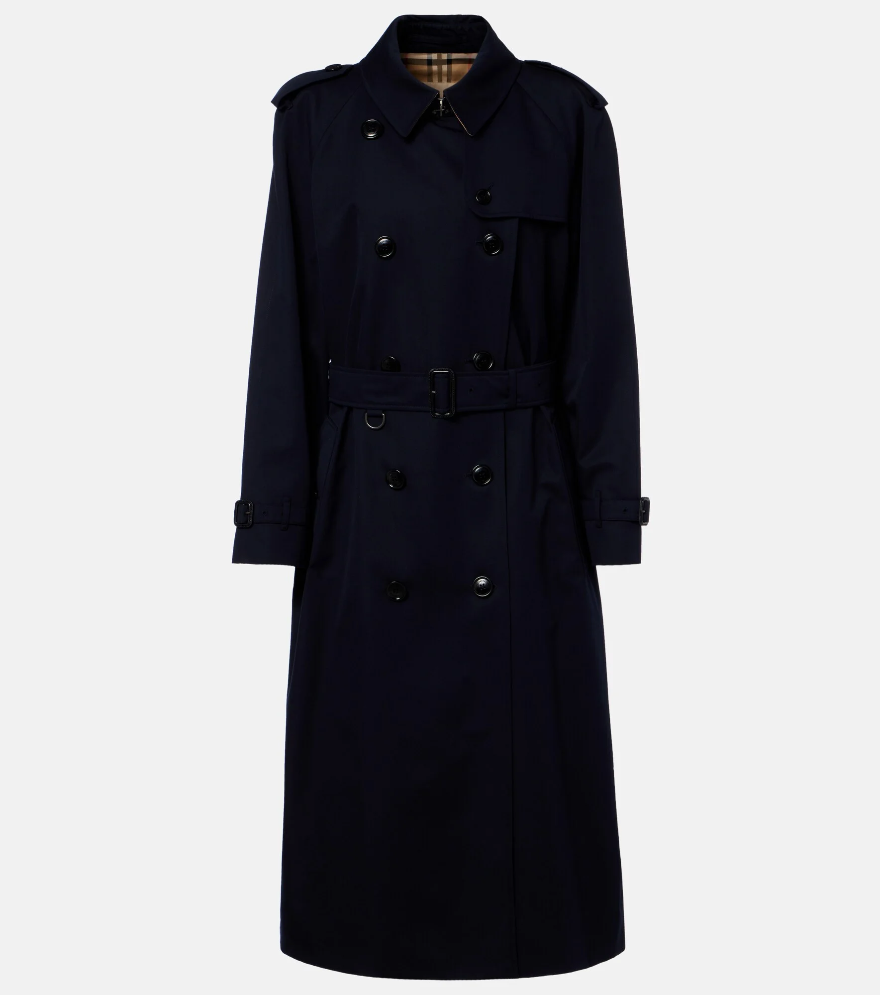 Exude signature style in this trench coat from Burberry. Crafted from cotton gabardine, the long-line design boasts a double-breasted silhouette with a detachable belt, epaulettes, and buttoned pockets. Product Details - Material: 100% cotton - Care instructions: dry clean - Made in the UK - Color: blue - Designer color name: Coal Blue - Closure: double-breasted buttoned front - Detachable belt - Belt loops - Pockets: buttoned pockets - Lining: 100% cotton - Sleeve lining: 100% cotton - Contains non-textile parts of animal origin - Item number: P01166217 Size & Fit - True to size - Loose fit, comes with belt - Non-stretchy fabric - The model seen in the picture is 178cm-5'10" and wearing a size UK 8