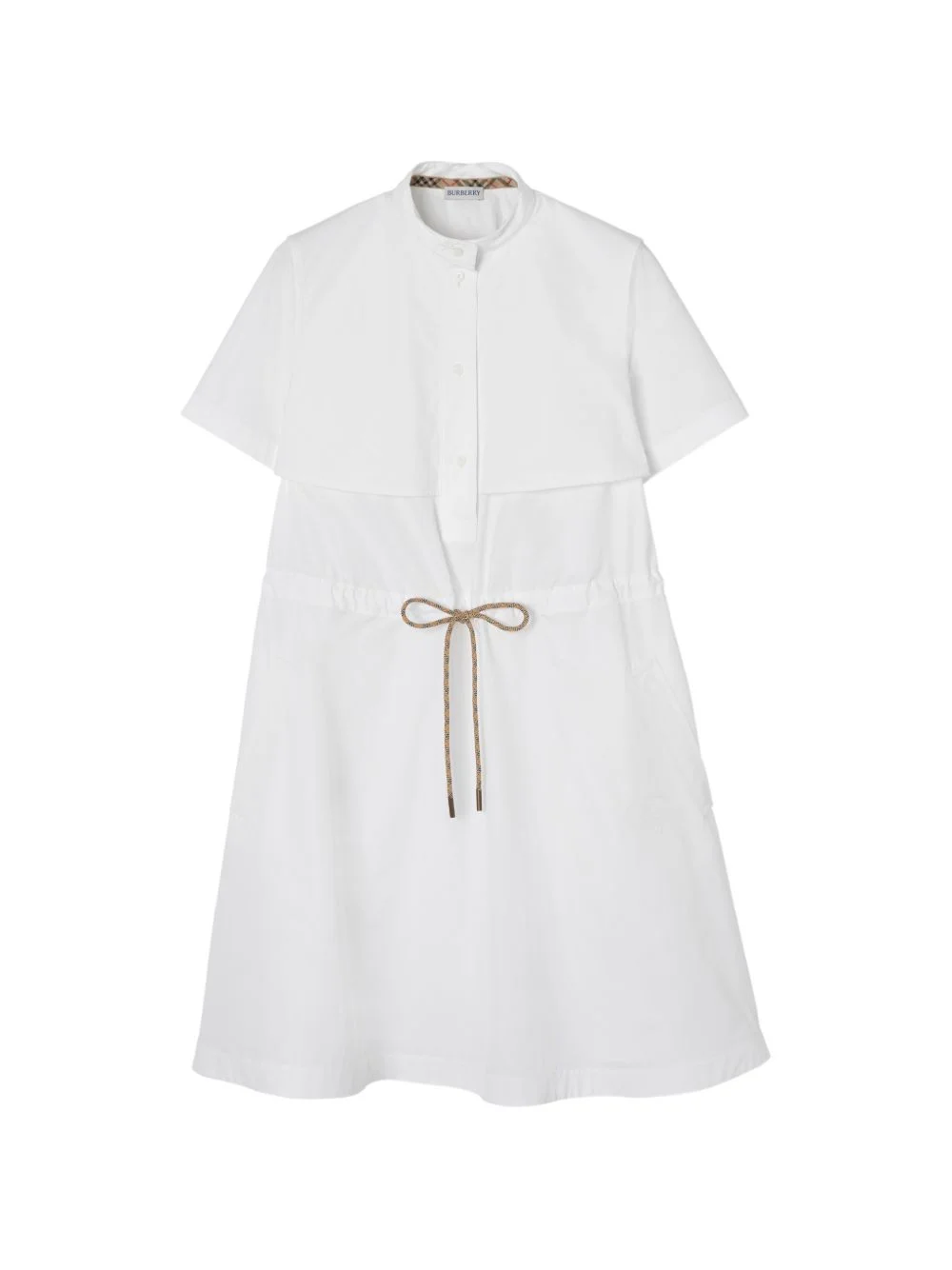 cotton poplin dress Highlights - A short-sleeved dress made from cotton poplin, tailored to a regular fit with a burberry check drawcord to adjust the waist. reworking elements from our signature rainwear, the flared silhouette is detailed with gun flaps and a storm shield. our knight stamp features as a tonal embroidered detail – the archival motif was first seen on burberry bags in the 1980s. - Button closure - Grandad collar - Drawcord waist - Gun flaps at shoulders - Storm shield at back - Side welt pockets - Embroidered equestrian knight design at front Imported Composition Cotton 100% Washing instructions Dry Clean Only
