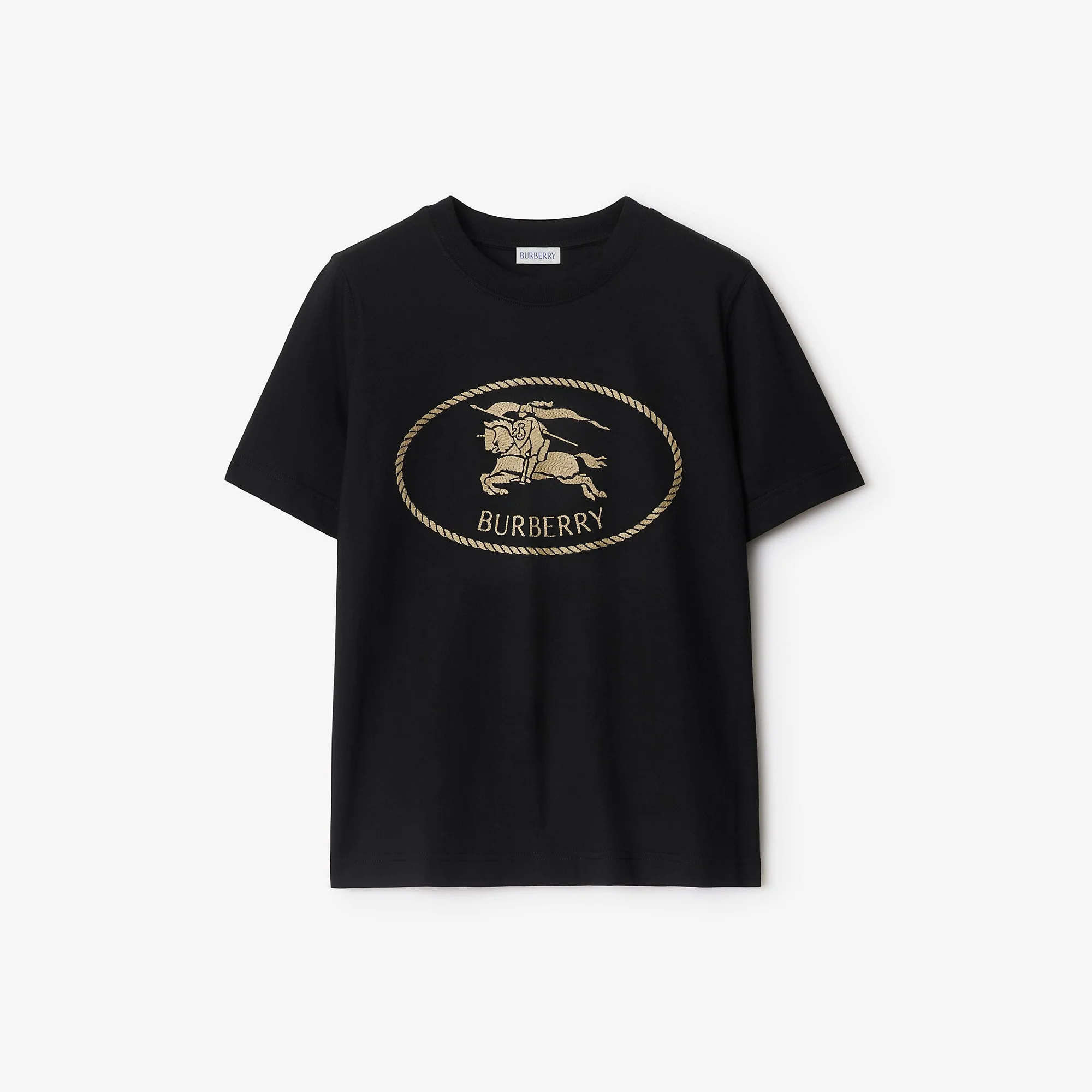 Product Details A T-shirt in lightweight cotton jersey, cut to a slim fit. The style is embroidered with our Knight stamp, an archival motif first seen on Burberry bags in the 1980s. - Rib-knit neckline - Embroidered Equestrian Knight Design at chest - Slim fit: this style is cut to a fitted silhouette. Fits true to size, take your normal size. - Machine wash - Item 81116581 Size & Fit - Length: 61cm/24in (size UK S) - Model’s height: 177cm/5ft 10in. Model wears size UK S Fabric & Care - 100% cotton - Trim: 97% cotton, 3% elastane - Made in Portugal