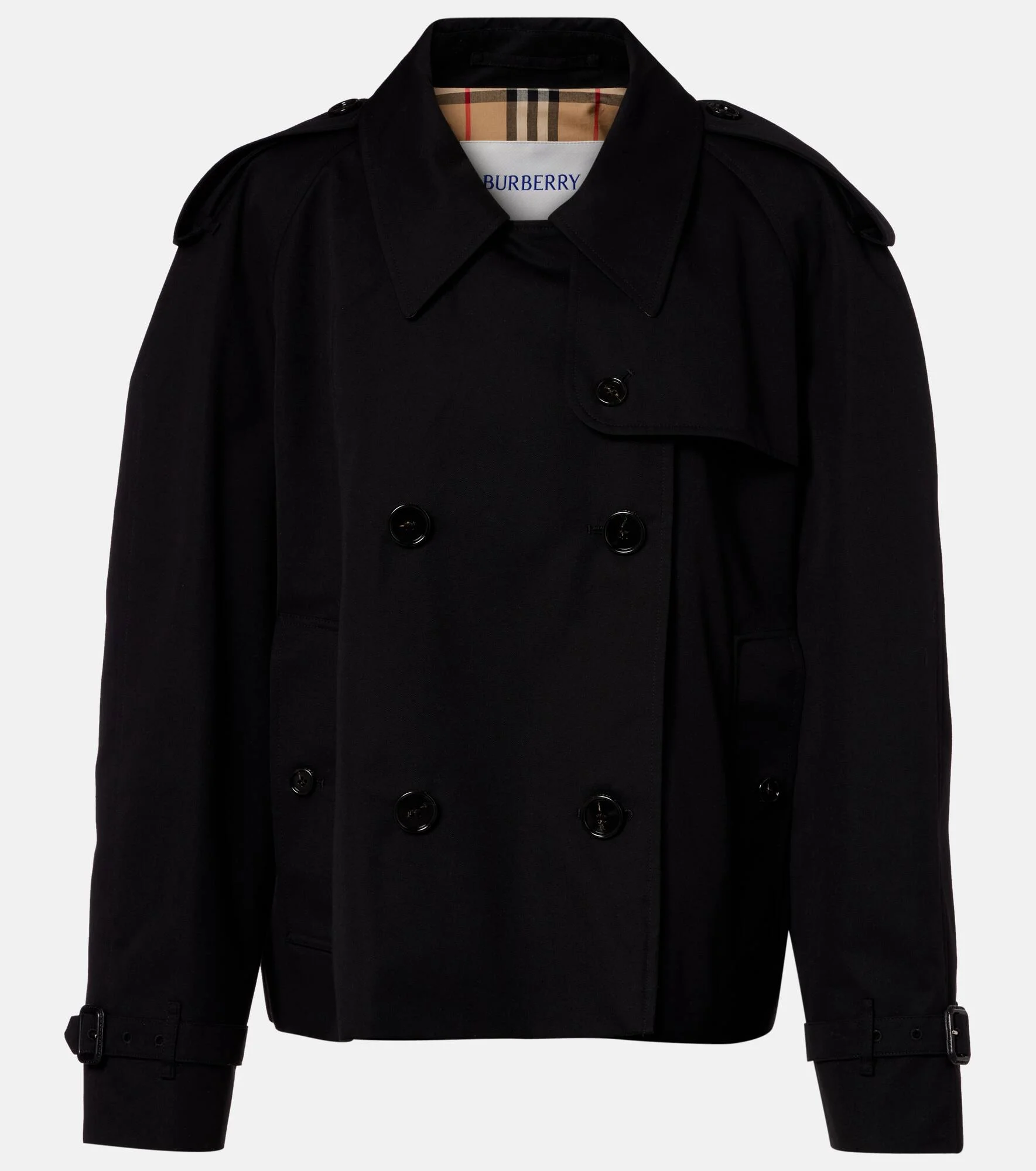 This cropped trench coat from Burberry is primed for your timeless outerwear rotation. Made from cotton gabardine, the double-breasted style is complete with epaulettes and features the iconic Burberry Check on the inside. Product Details - Material: 100% cotton - Care instructions: dry clean - Made in the UK - Color: black - Designer color name: Black - Item color: black - Lining: 100% viscose - Pockets: buttoned pocket - Closure: double-breasted - Epaulettes - Item number: P01143372 Size & Fit - True to size - Designed for a loose fit - Non-stretchy fabric - Falls to the hip - The model seen in the picture is 178cm-5'10" and wearing a size UK 6