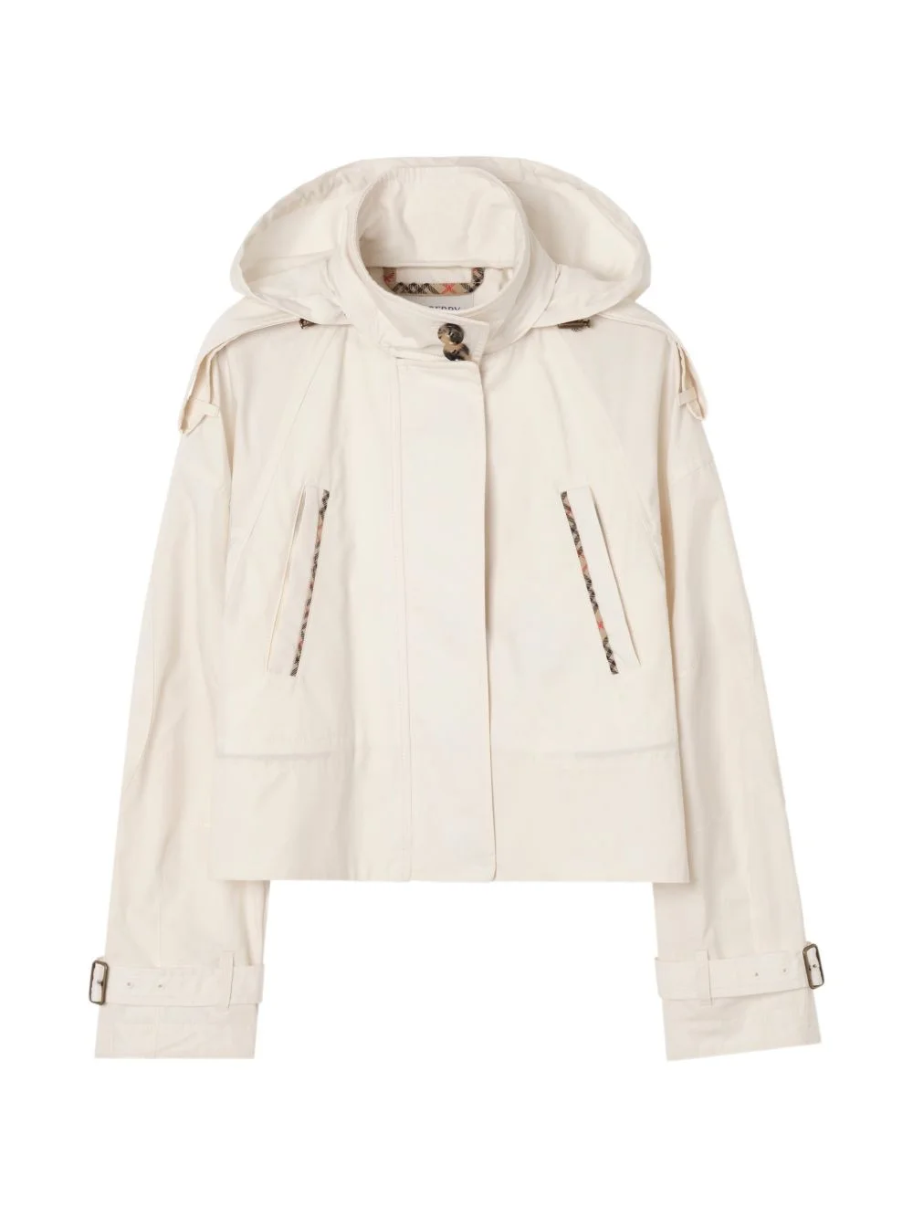 cropped lightweight cotton Ladymoor jacket Highlights - A fresh take on the parka, the ladymoor jacket is tailored from lightweight water-resistant cotton with a soft finish. the cropped silhouette is shaped to a regular fit with a drawcord at the waist to create a peplum hem. raglan construction gives a softer line at the shoulders, topped with epaulettes inspired by our signature trench. details include chest pockets edged with archive beige burberry check piping and a detachable hood for unpredictable weather. - Button and two-way zip closure - Detachable drawcord hood, drawcord waist - Epaulettes - Chest zip pockets - Belted cuffs - Comes with a garment bag - Regular fit. fits true to size, take your normal size. Made in Italy Composition Outer: Cotton 100%, Calf Leather 100%, Buffalo Horn 100% Lining: Cotton 100% Washing instructions Read Manufacturer Guidelines