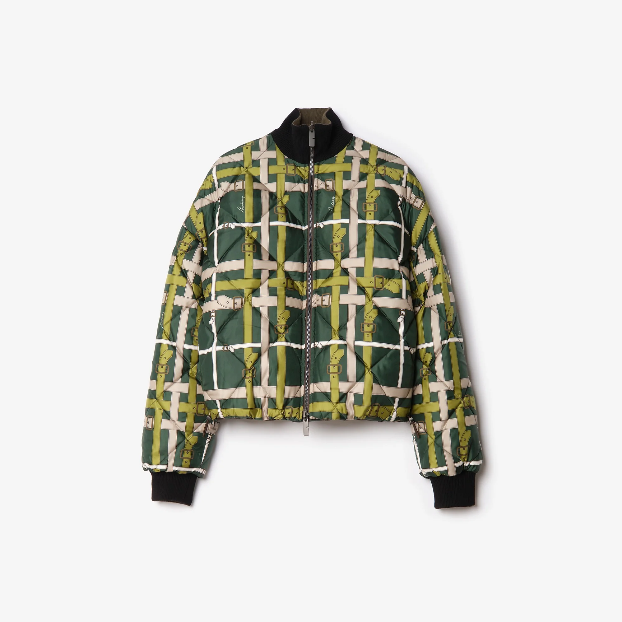 Product Details Relaxed fit: a looser cut than our regular fit. A cropped nylon jacket printed with an archival design – belts from our iconic raincoats intertwine to form the Burberry Check. The style reverses to a solid colour with leather trims and an embroidered Equestrian Knight Design. Cut to a relaxed fit and padded with goose down and feathers for cooler days. - Two-way zip closure; reverse press-stud and zip closure - Side zip pockets - Drawcord hem - Rib-knit trims - Embroidered Equestrian Knight Design on reverse - Comes with a garment bag - Item 81181271 Size & Fit - Relaxed fit: a looser cut than our regular fit. - Length: 56cm/22.1in (size UK S) Fabric & Care - Outer: 100% polyamide - Reverse: 100% polyamide - Trims: 100% lambskin; 89% wool, 9% polyamide, 2% elastane - Filling: 80% goose down, 20% goose feathers - Wipe clean with a damp cloth, do not use solvents - Imported