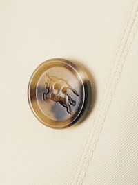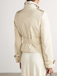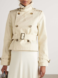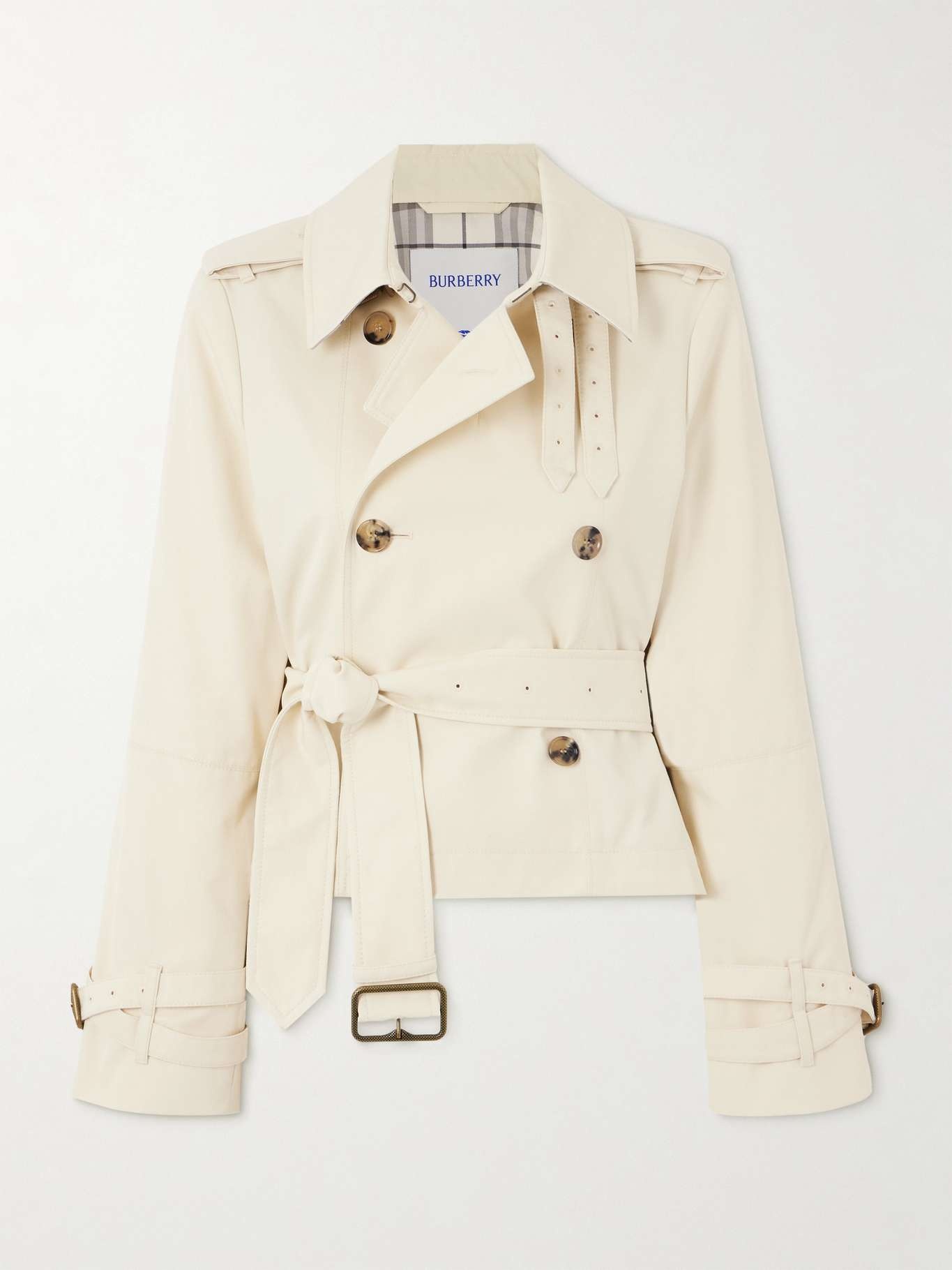 EDITORS'NOTES Burberry's ability to refresh historic house styles for today is testament to its enduring legacy. Just like the original trench coats that inspired it, this jacket is cut to exact standards for a short double-breasted profile from signature gabardine and belted to define your waist. Note the smart buttoned shoulder epaulettes and buckle-fastening cuffs and throat latch. SIZE & FIT Model measurements: - Fits true to size, take your normal size - Intended for a boxy fit, use the belt to cinch in at the waist - Mid-weight, non-stretchy fabric - Model is 180cm/ 5'11" and is wearing a UK 8 - Bust: 85cm/ 33.5" - Waist: 62cm/ 24.5" - Hip: 88cm/ 34.5" DETAILS & CARE - Off-white gabardine - Button fastenings through double-breasted front - 65% polyester, 35% cotton; buttons: 100% horn (Buffalo); lining: 100% viscose - Dry clean