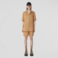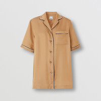 PRODUCT DETAILS A classic short-sleeved silhouette cut from an Italian-woven silk satin blend, framed with contrasting piping and light-catching crystals. Shirt length: 67cm/26.4in. This is based on a size UK 6 as proportions change slightly according to size. Model’s height: 177cm/5ft 10in. Model wears size UK 6. 58% cupro, 42% silk Trims: 100% silk; 66% brass, 33% crystal, 1% silver Short sleeves Revere collar Chest patch pocket Curved hem Specialist dry clean Made in Italy 80549271